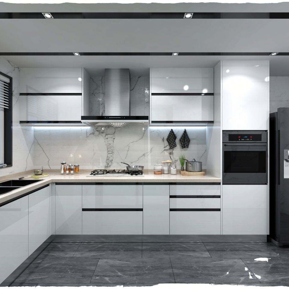 ตู้ครัวสไตล์ยุโรปสมัยใหม่แผงประตูกระจกเคลือบแล็กเกอร์ไม้อัดไม้เนื้อแข็งสแตนเลสอะคริลิค MDF สำหรับอ่างล้างหน้าในตู้เย็น