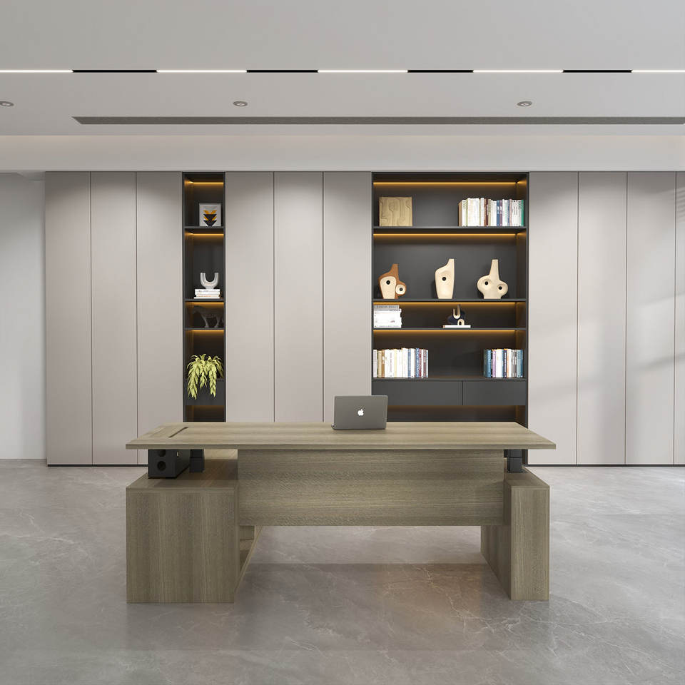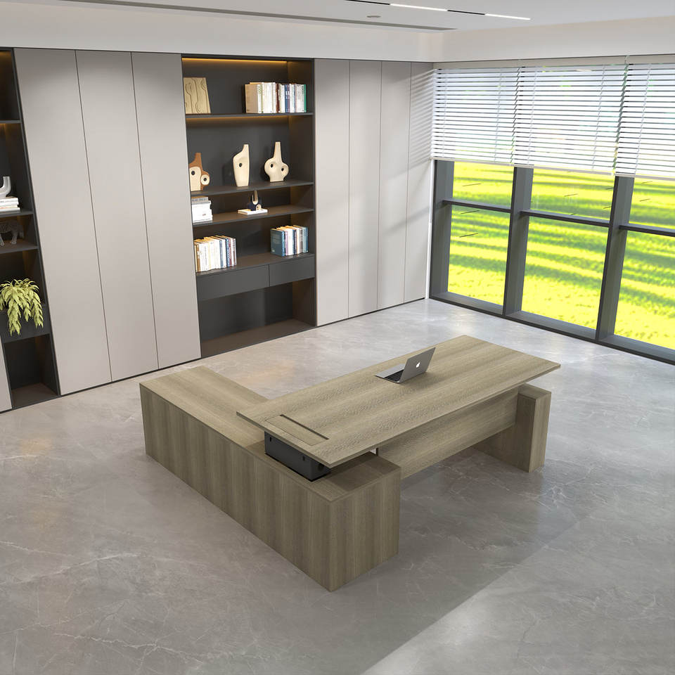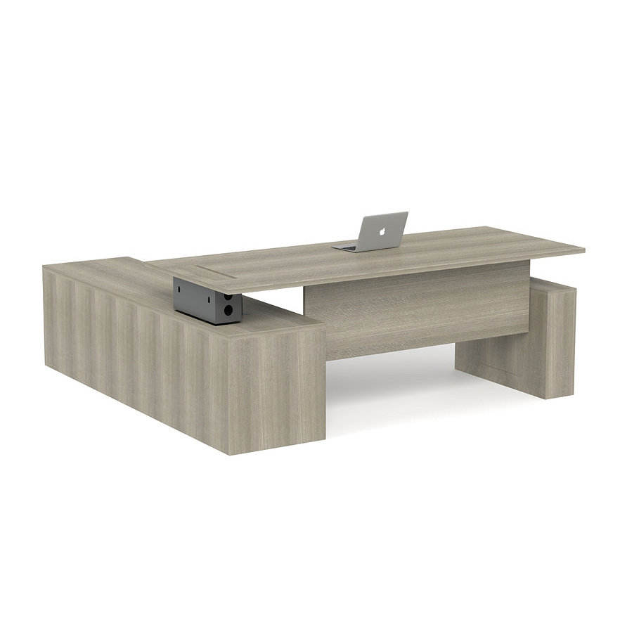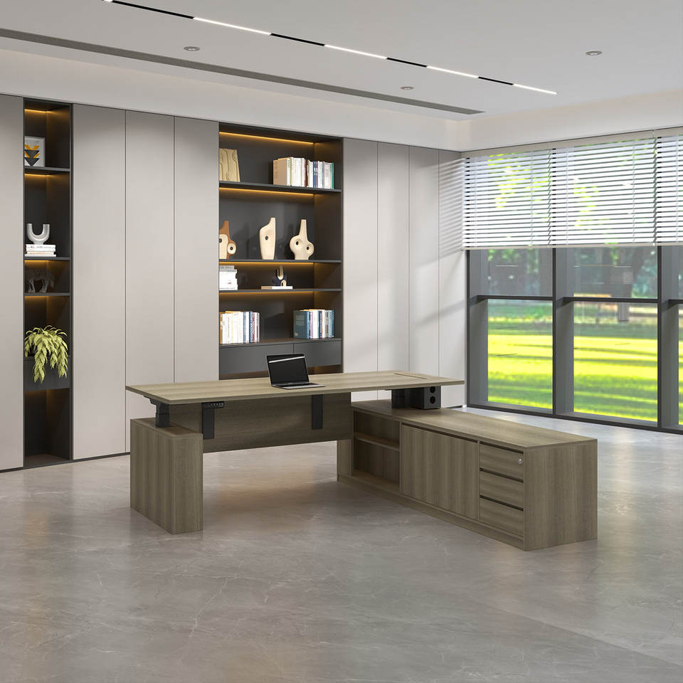 โต๊ะทำงานผู้บริหารรูปตัวแอลแบบปรับระดับความสูงด้วยไฟฟ้า พร้อมที่เก็บของ มอเตอร์คู่ ปรับได้ทั้งแบบนั่งและยืน เหมาะสำหรับผู้บริหาร
