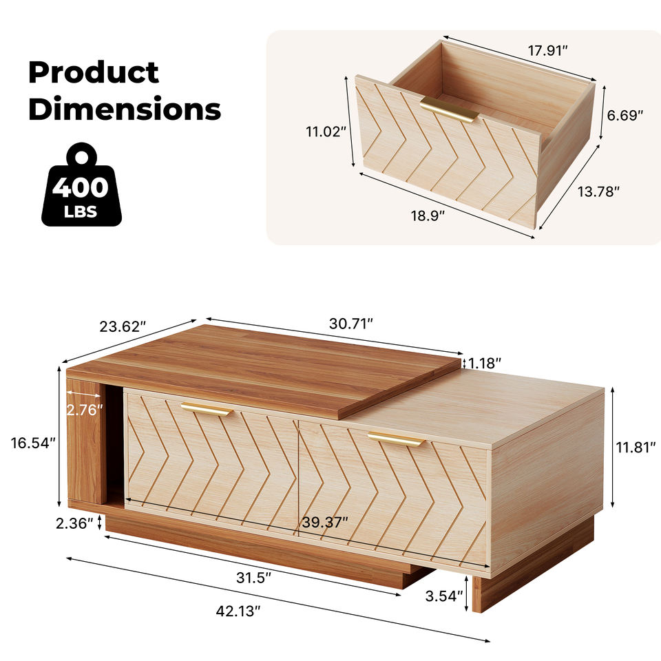 โต๊ะกาแฟแบบขยายได้ทันสมัย พร้อมที่เก็บของแบบซ่อน ดีไซน์ไม้สองสี ปรับความยาวได้ เฟอร์นิเจอร์ห้องนั่งเล่นสำหรับพื้นที่ขนาดเล็ก