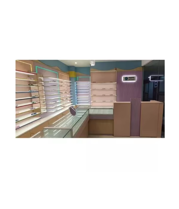 การออกแบบตกแต่งภายในร้านแว่นตาสมัยใหม่ พร้อมไฟ LED อัจฉริยะระดับพรีเมียม ชั้นวางแว่นตาสุดหรูแบบติดผนัง