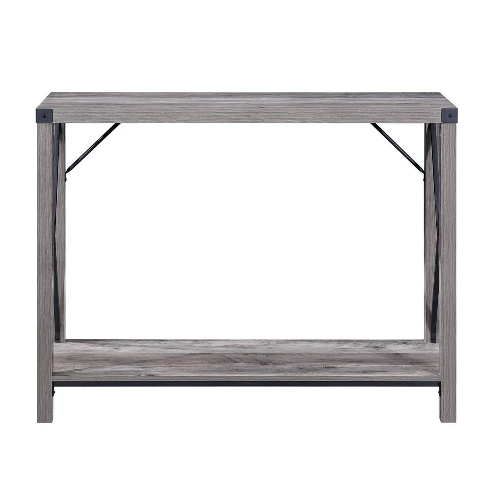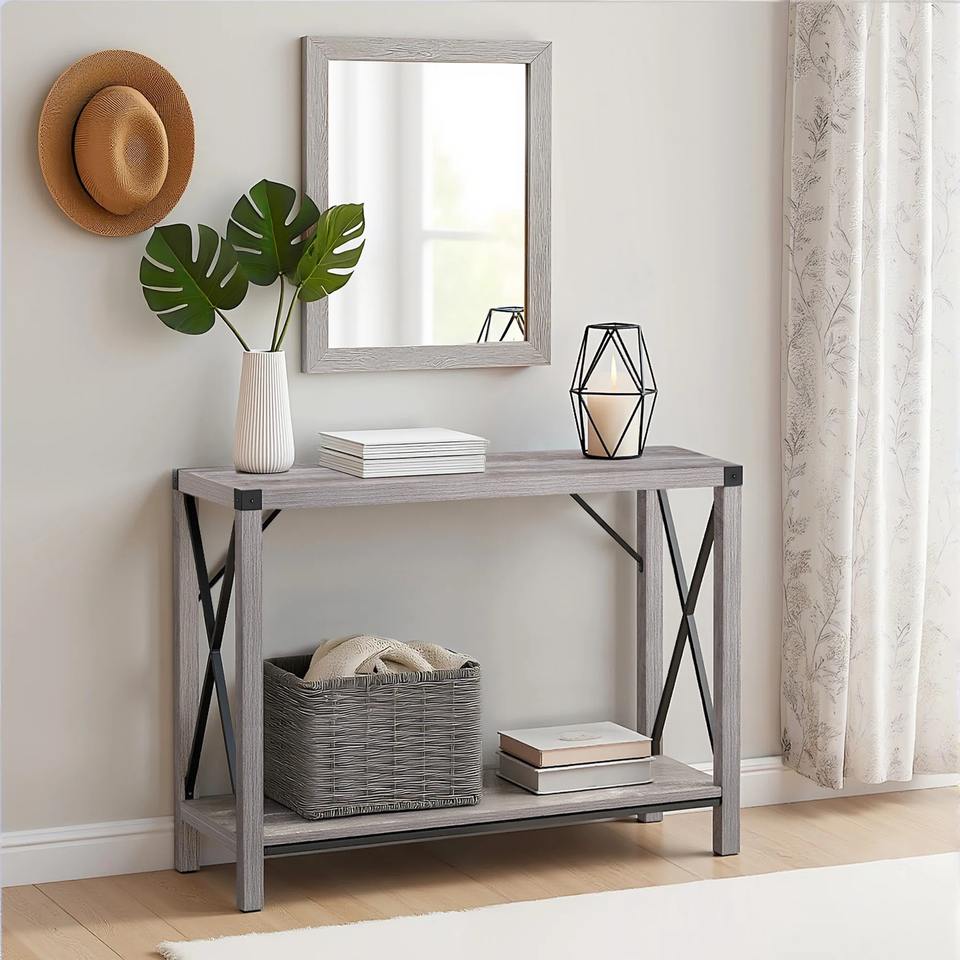 โต๊ะโซฟาสไตล์โมเดิร์นฟาร์มเฮาส์ โครงเหล็กดีไซน์วินเทจ ชั้นวางของแบบเปิด 2 ชั้น พร้อมกระจกเงา ใช้เป็นโต๊ะทำงานในโถงทางเข้าได้