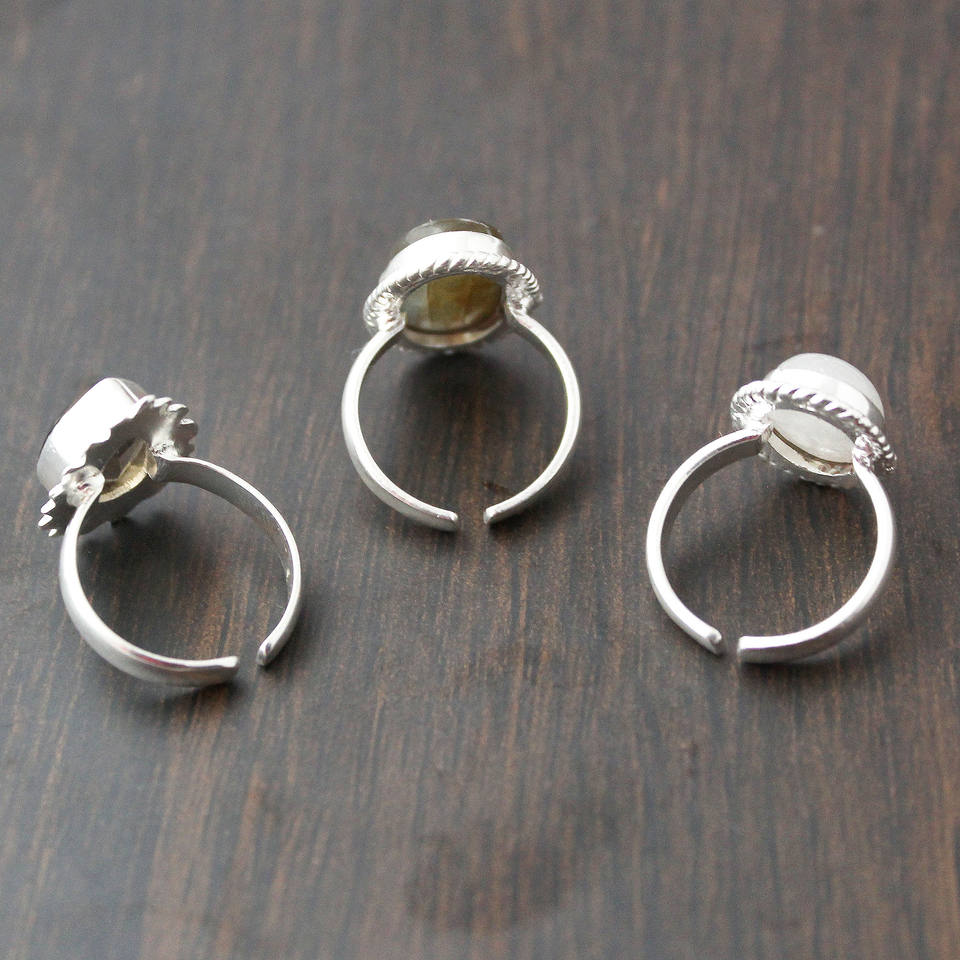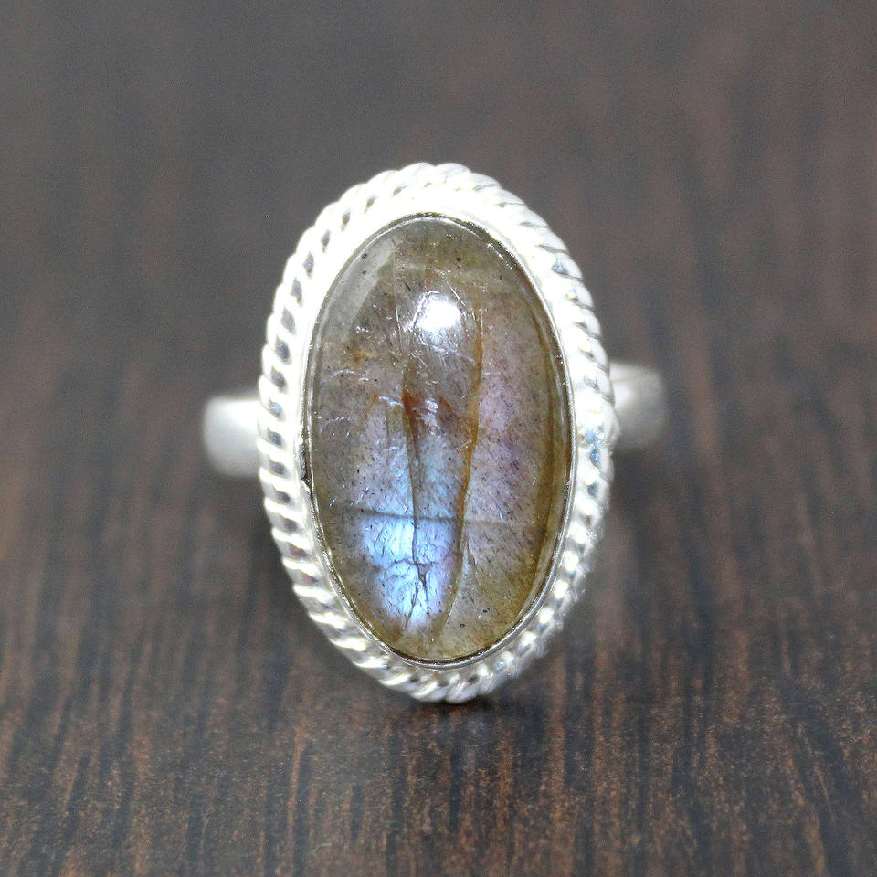 แหวนสตรีชุบด้วยไฟฟ้าสีเงินรูปวงรีทำจากหินลาบราดอไรต์ธรรมชาติสไตล์แฟชั่นสมัยใหม่สำหรับการหมั้นขายส่ง