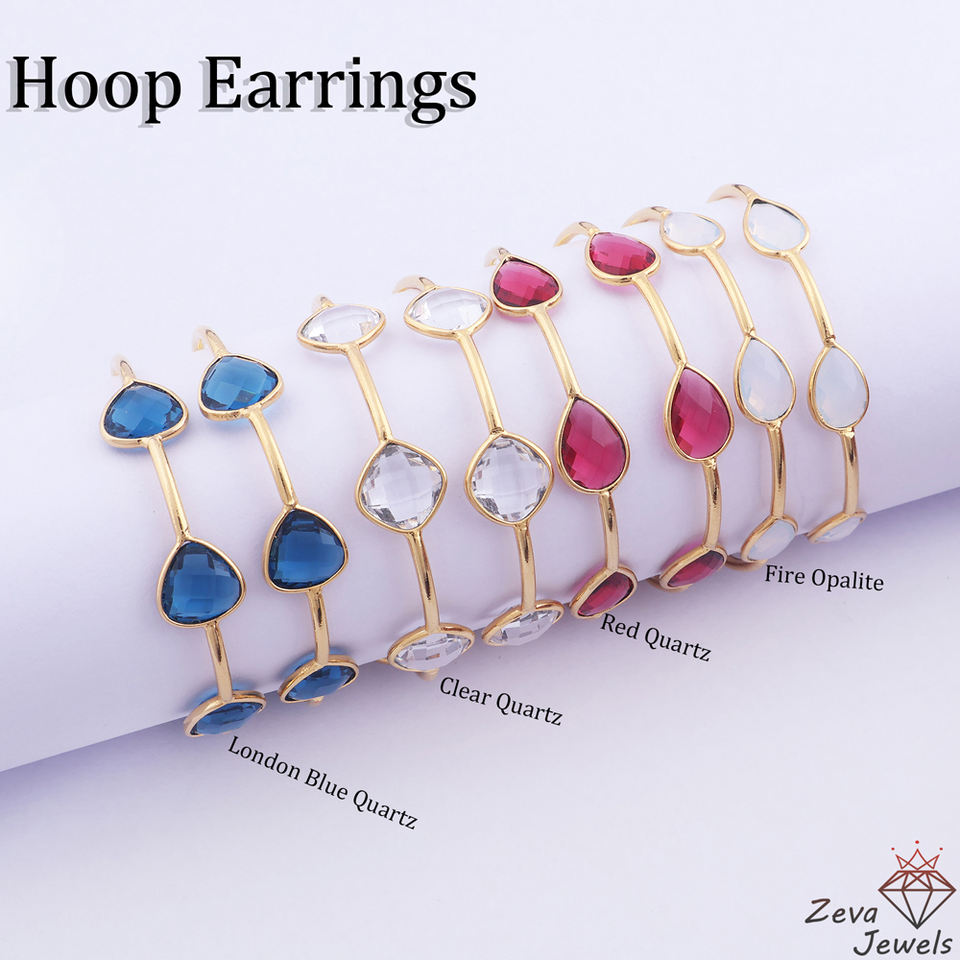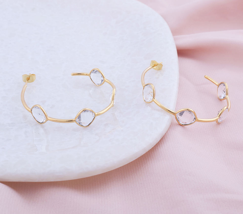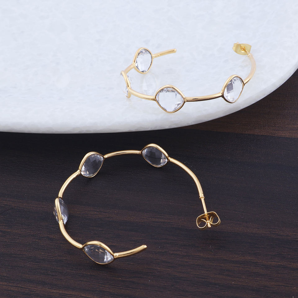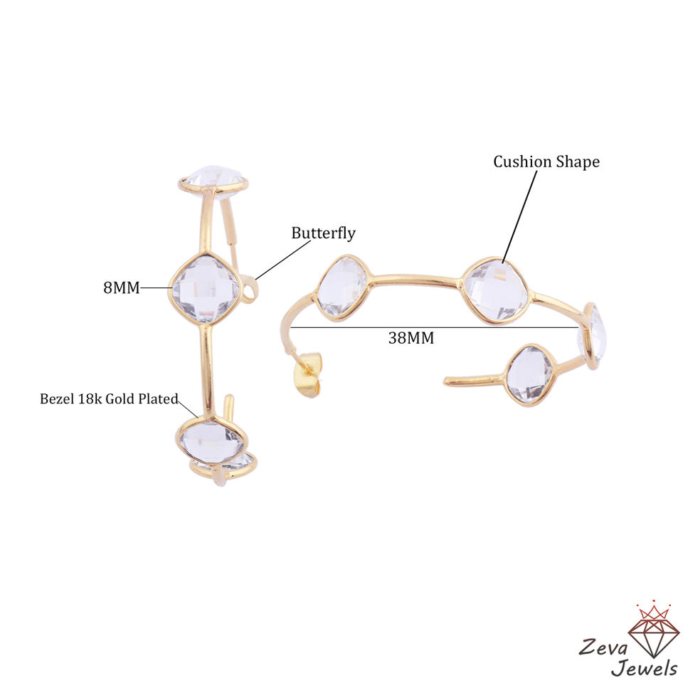 เครื่องประดับผู้หญิงที่ทันสมัยรูปทรงเบาะขนาดเล็กใสควอตซ์อัญมณีห่วงต่างหูทองเหลืองชุบทองตั้งค่าการตัดขอบ