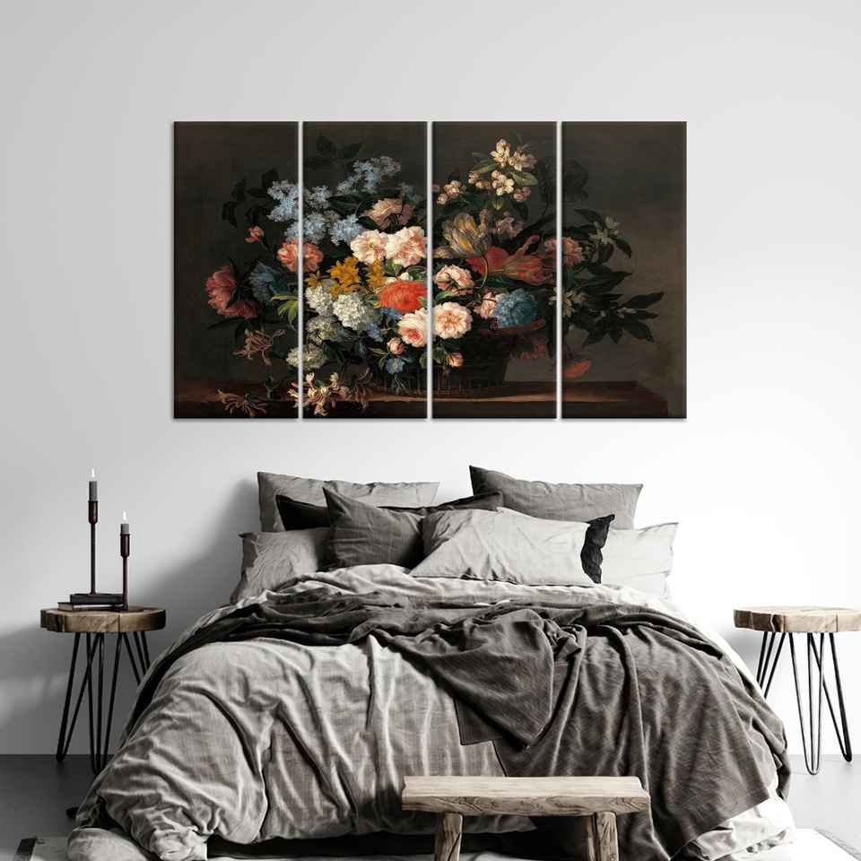 ภาพพิมพ์บนผ้าใบลายดอกไม้สมัยใหม่: งานศิลปะติดผนังลายดอกไม้ดีไซน์หรูหรา ชุดผ้าใบ 4 ชิ้น