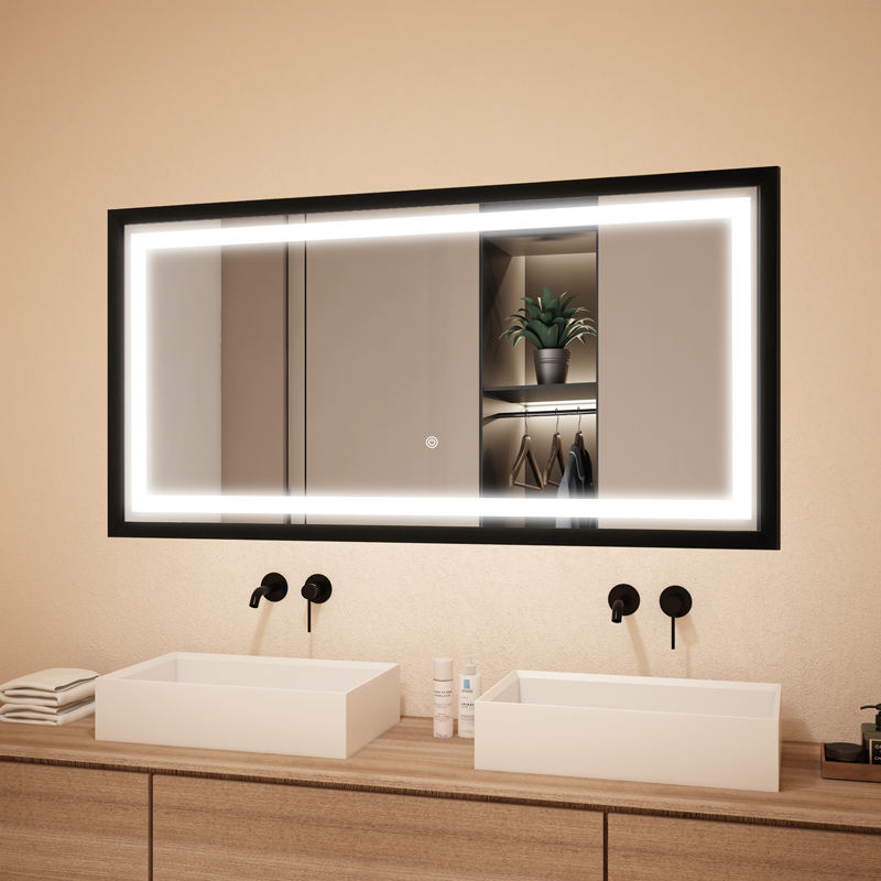 กระจก LED แบบมีกรอบทันสมัยพร้อมกรอบอะลูมิเนียมสีดำ หน้าจอสัมผัส กระจกห้องน้ำอัจฉริยะสำหรับโรงแรมและวิลล่า รองรับการออกแบบกราฟิก