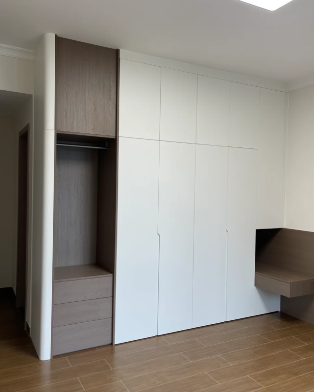 ตู้เสื้อผ้าไม้เมลามีนแบบตั้งได้ทันสมัยสำหรับห้องนอนโรงแรมประตูบานพับคุณลักษณะพับได้สะอาดสำหรับใช้รับประทานอาหาร