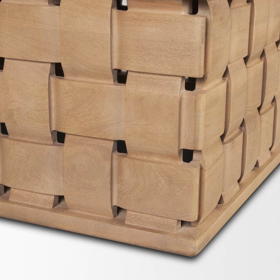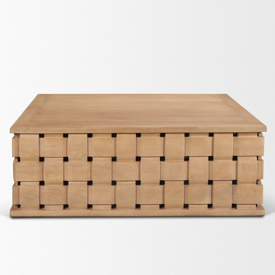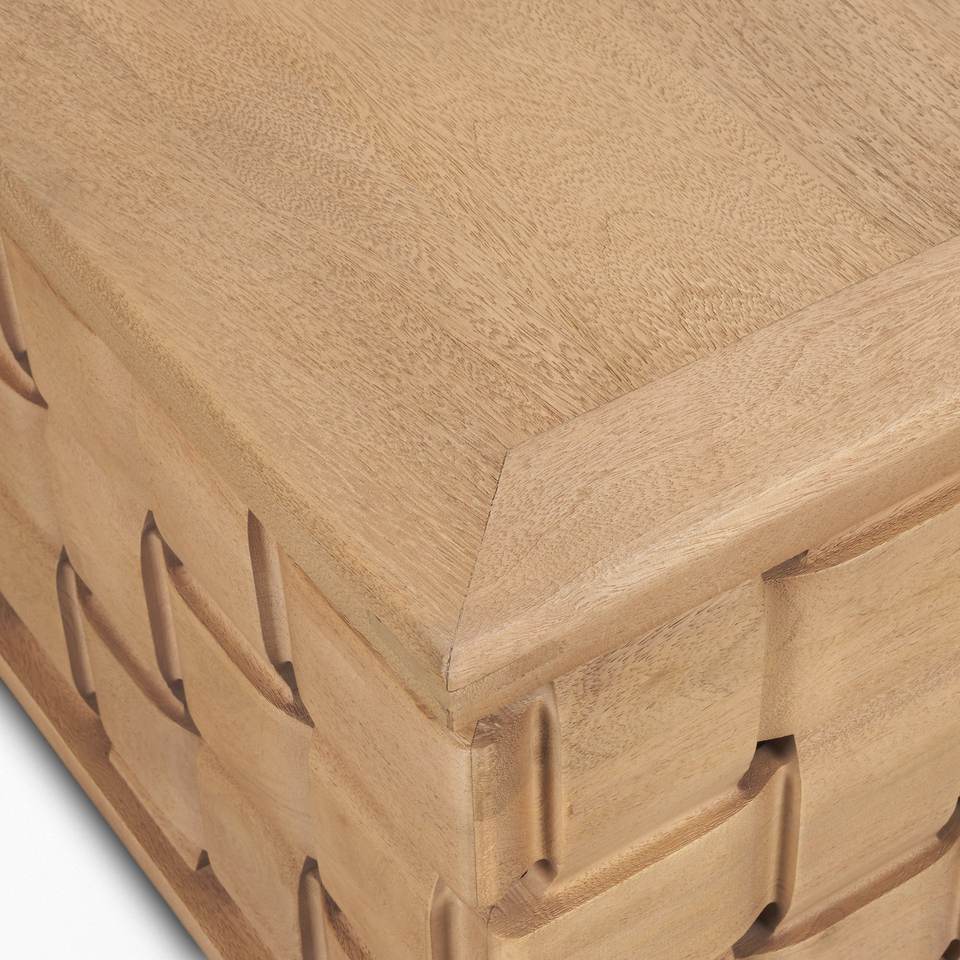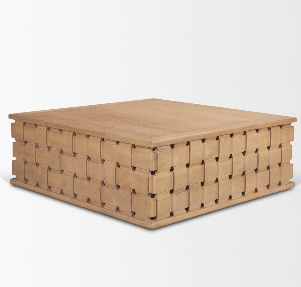 โต๊ะกลางห้องนั่งเล่นทรงสี่เหลี่ยมทำจากไม้มะม่วงเนื้อแข็ง ขอบคม ผิวเรียบ ฐานแกะสลักด้วยเครื่อง CNC ทันสมัย