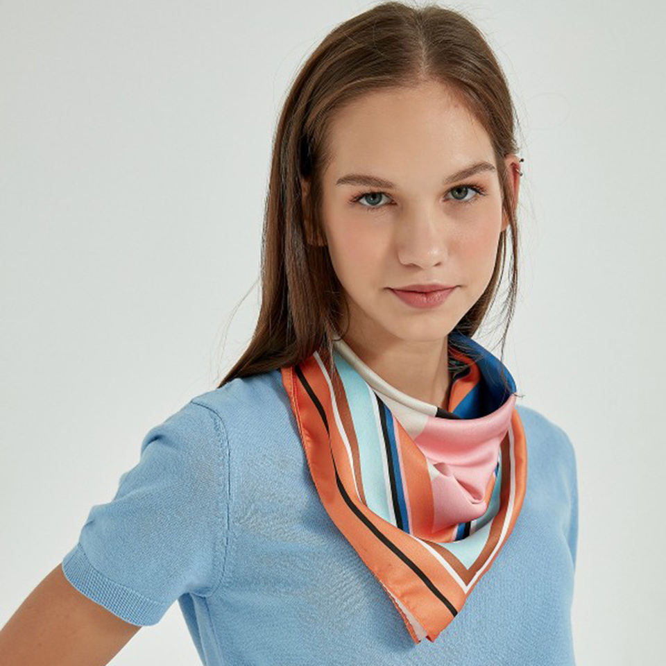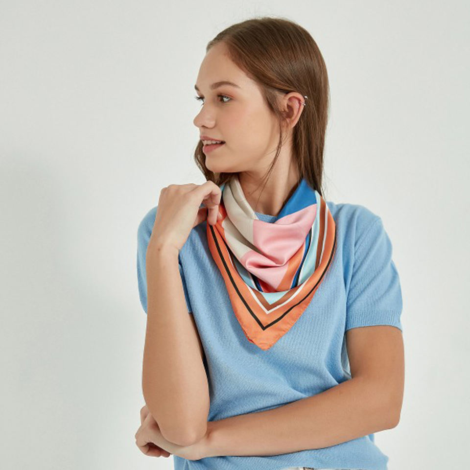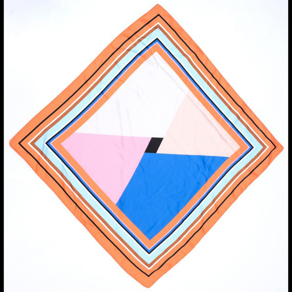 ผ้าพันคอแฟชั่นทรงสี่เหลี่ยมเล็ก ลายบล็อกสีเรขาคณิตทันสมัย เนื้อผ้าคล้ายผ้าไหม ผลิตจากโพลีเอสเตอร์ซาติน ขอบเย็บด้วยเครื่องจักร