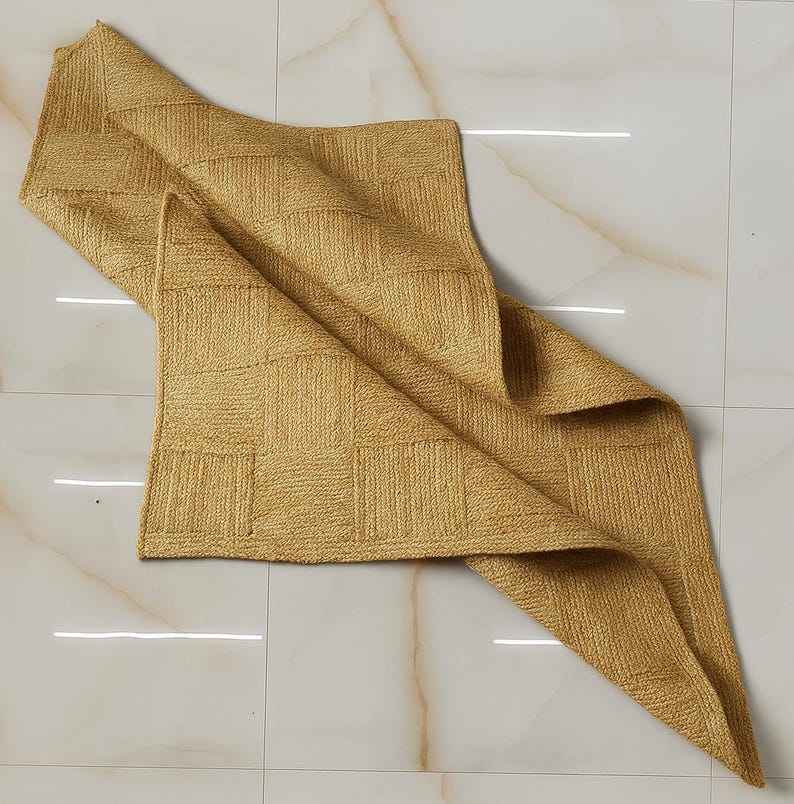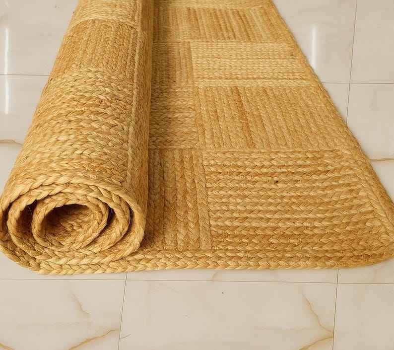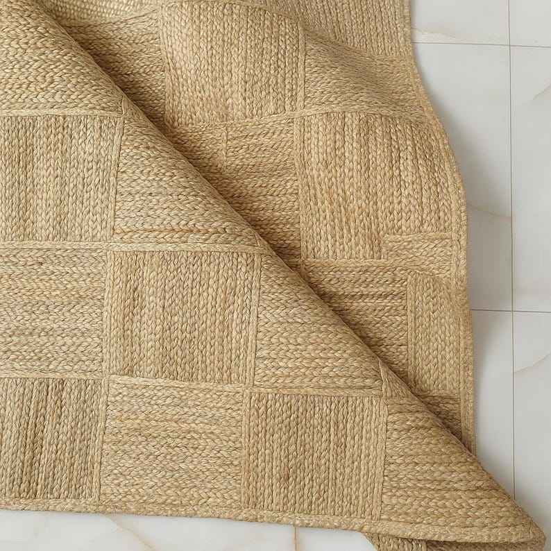 พรมปูพื้นลายตารางแบบเรขาคณิตทันสมัย ทำด้วยมือจากเส้นใยปอกระเจา ดีไซน์เรียบง่ายแต่หรูหรา เหมาะสำหรับตกแต่งบ้านสไตล์ชนบท