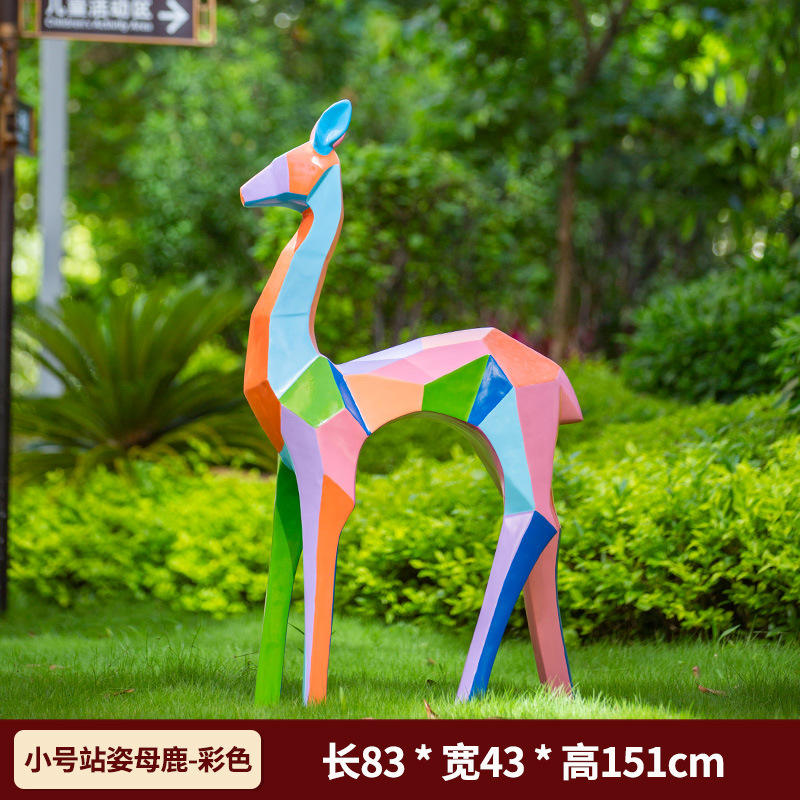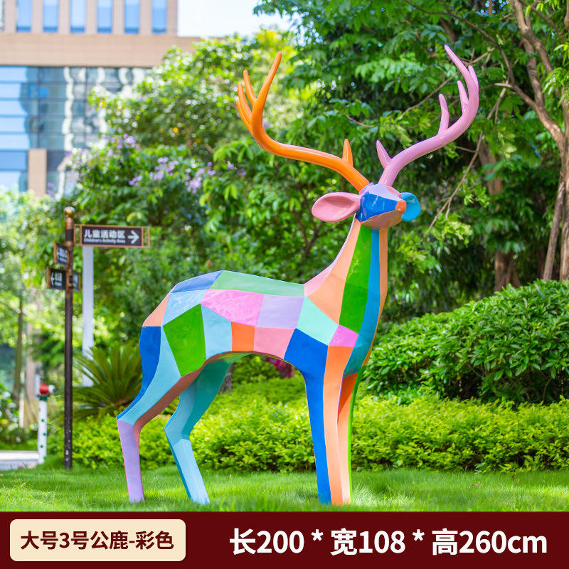 ประติมากรรมรูปกวางไฟเบอร์กลาสทรงเรขาคณิตสีรุ้งสมัยใหม่ ขนาดเท่าตัวจริง งานศิลปะเหมือนจริงสำหรับตกแต่งสวนภายนอกอาคาร ของสะสม