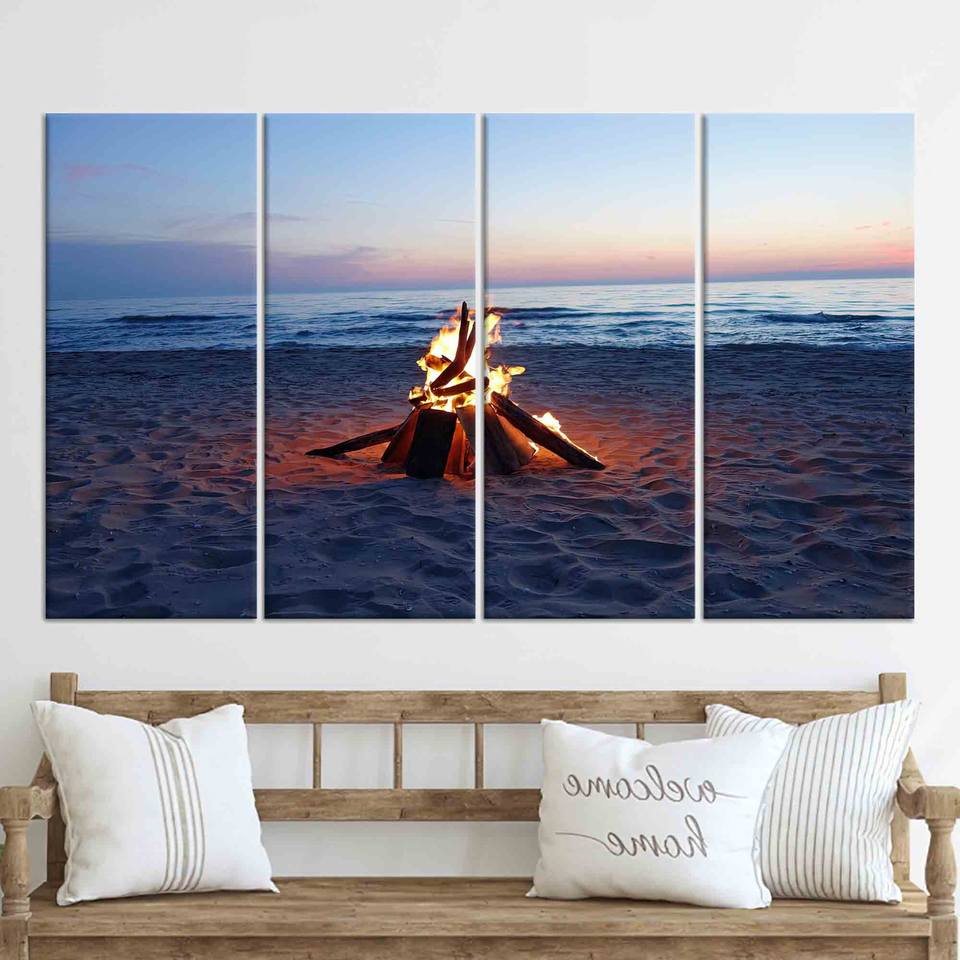 ภาพพิมพ์บนผ้าใบ Modern Glass Beach Bonfire: งานศิลปะที่แสดงความสงบสุขริมชายฝั่ง ชุดผ้าใบ 4 ชิ้น