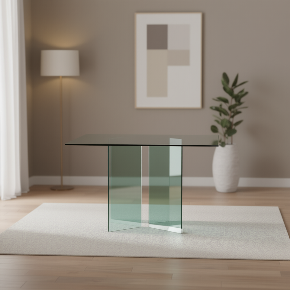โต๊ะรับประทานอาหารกระจกทันสมัย 120x120 ซม. หน้าโต๊ะทรงสี่เหลี่ยมใส พร้อมโครงสร้างขาคู่