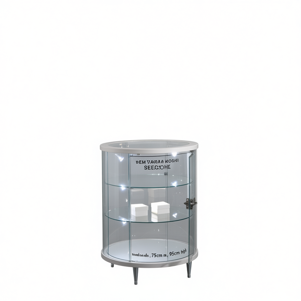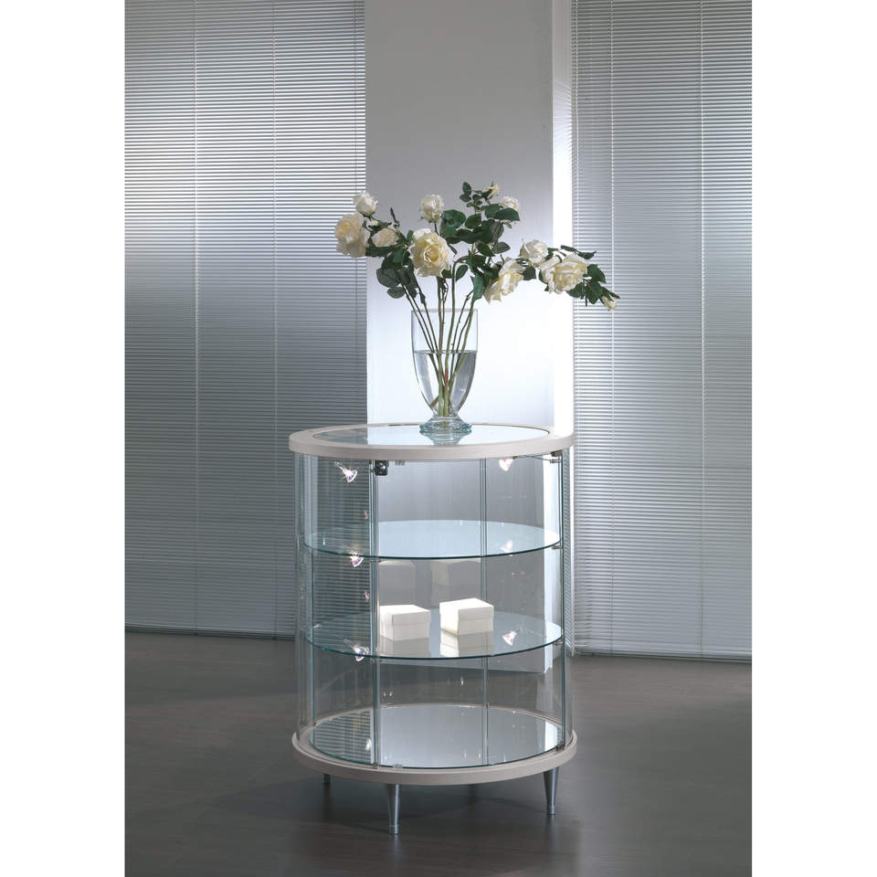 ตู้โชว์กระจกทรงกลมทันสมัย กว้าง 75 ซม. สูง 95 ซม. สีขาวเงา พร้อมประตูบานพับล็อคได้ และไฟ LED