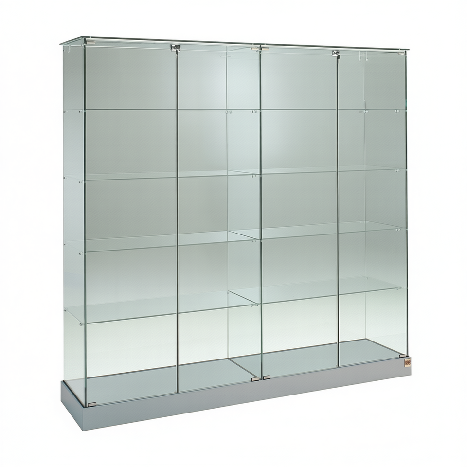 ตู้โชว์กระจกทันสมัย กว้าง 185 ซม. สูง 180 ซม. ฐานสีเทาอ่อน พร้อมล้อเลื่อนแบบซ่อนและประตูล็อคได้
