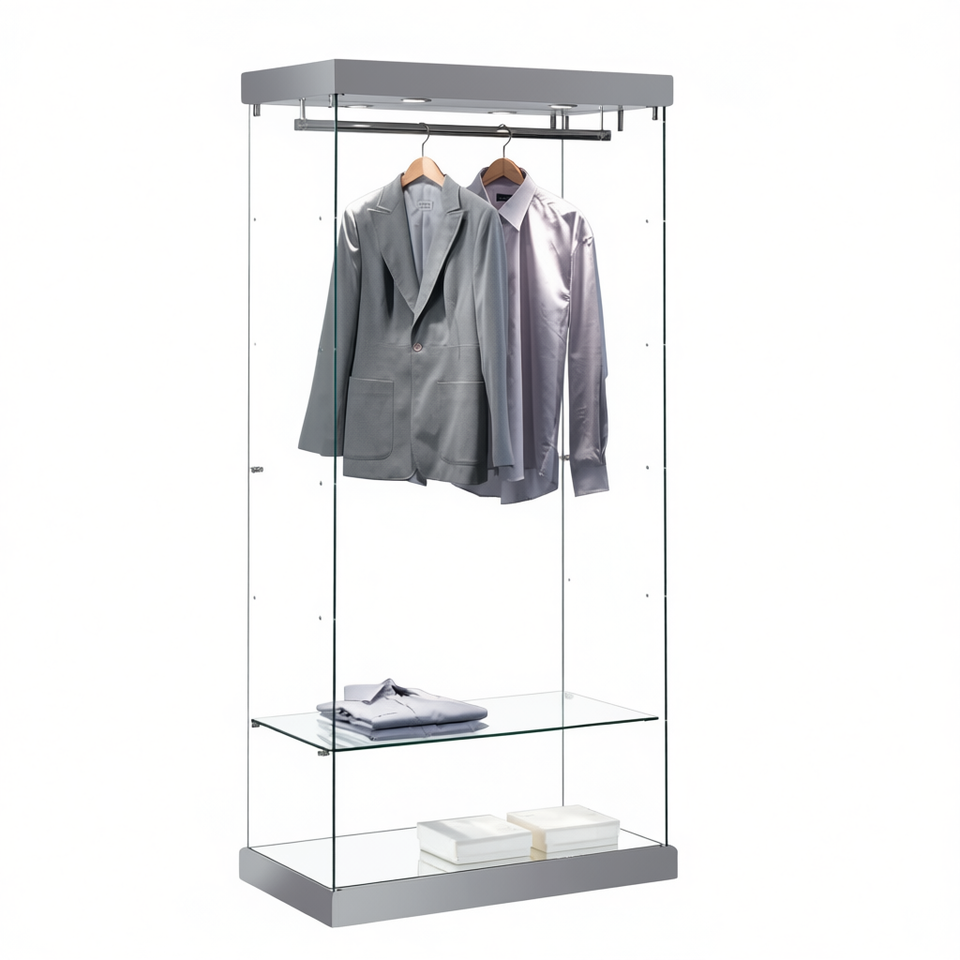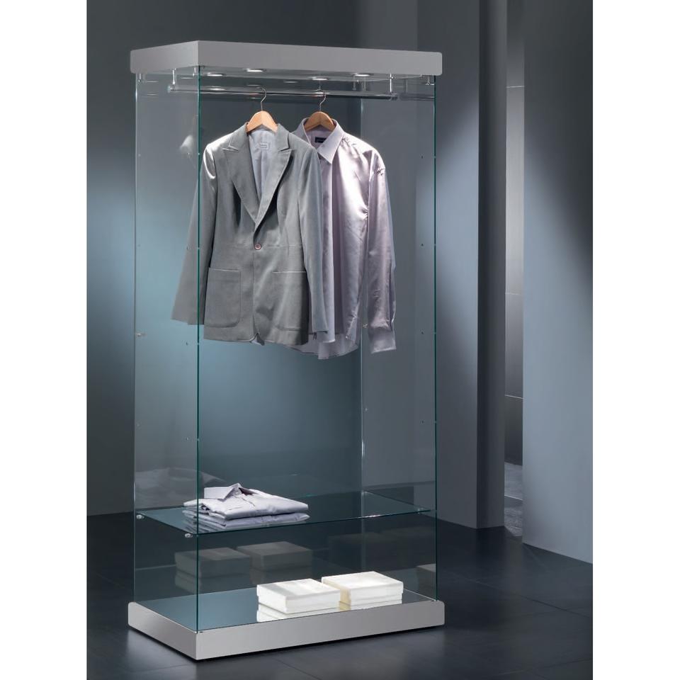 Modern Glass Showcase 93x53x200cm Light Grey With Led Lights And Clothes Rail Mirrored Base Hidden Castors