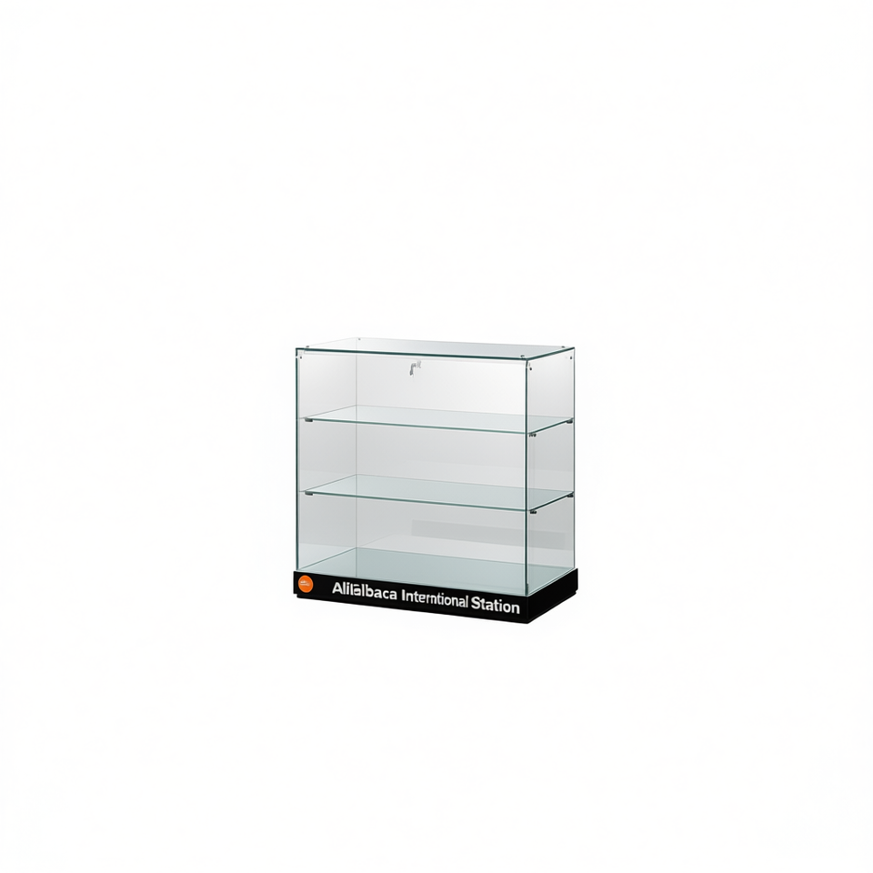 ตู้โชว์กระจกทันสมัย 95x46x90 ซม. พร้อมบานประตูล็อคได้และชั้นวางสองชั้น ฐานสีเทาอ่อน
