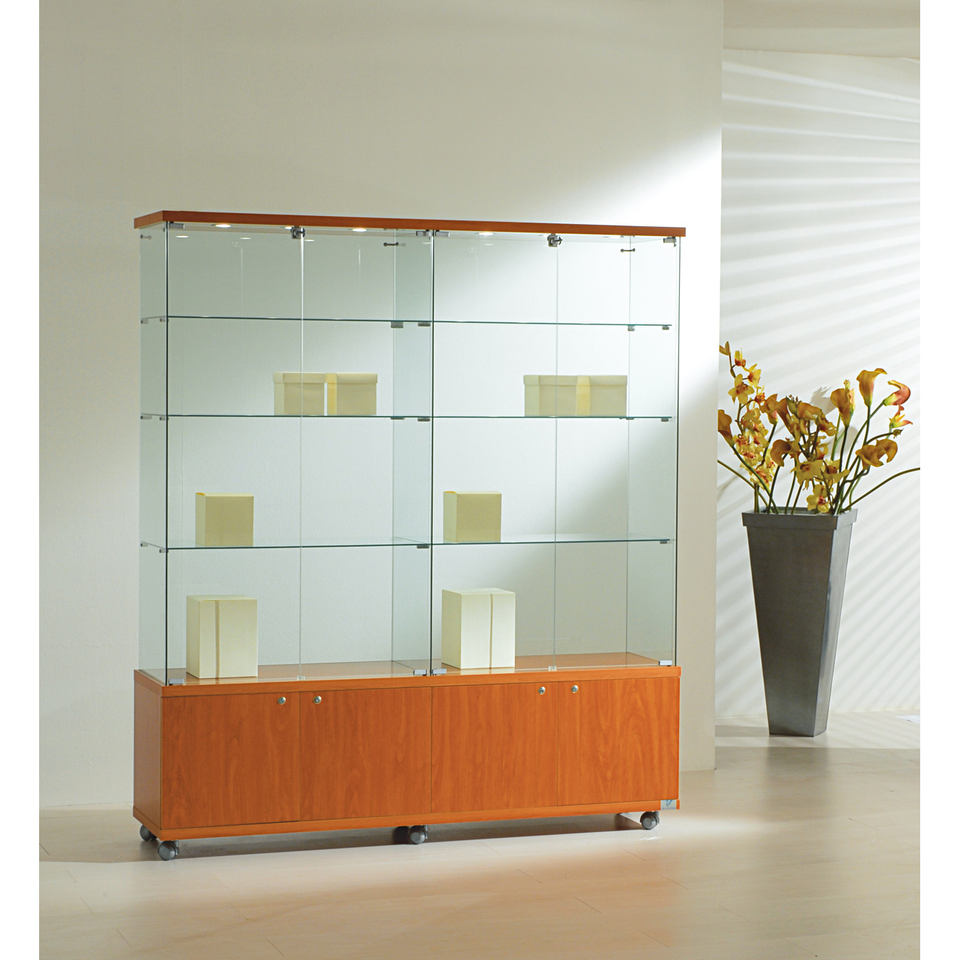 ตู้โชว์กระจกทันสมัย กว้าง 160 ซม. ฐานไม้เชอร์รี่ พร้อมประตูล็อคได้และชั้นวางปรับระดับได้ สำหรับโชว์ในห้องนั่งเล่น