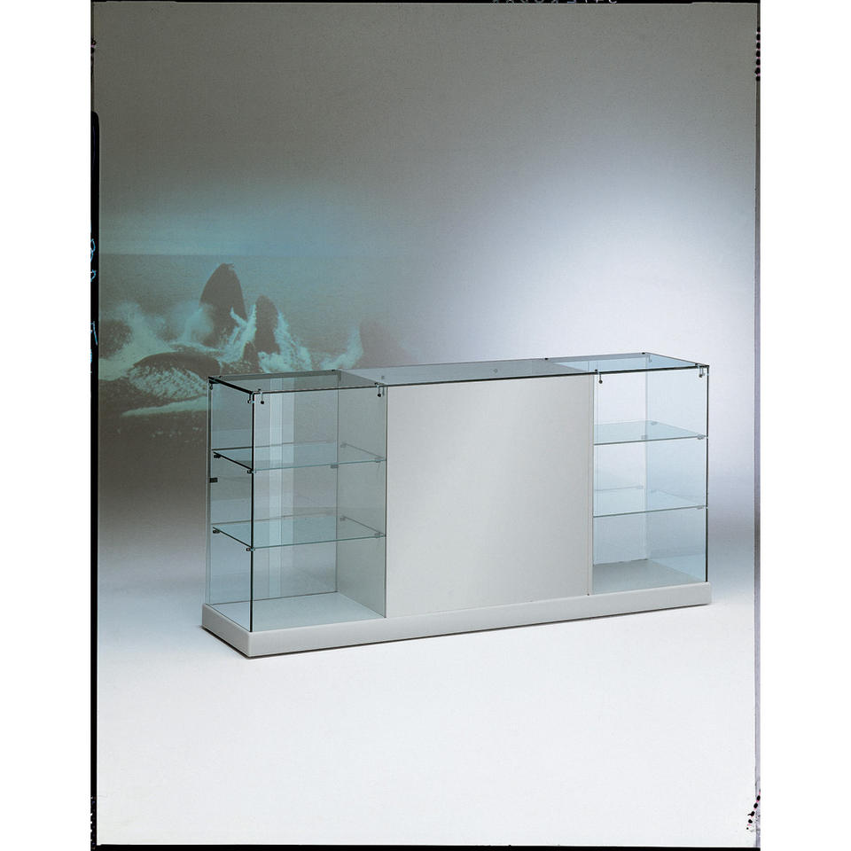 ตู้โชว์กระจกโมเดิร์น กว้าง 185 ซม. สีเทาอ่อน พร้อมบานประตูล็อคได้ และชั้นวางของสองชั้นด้านข้าง