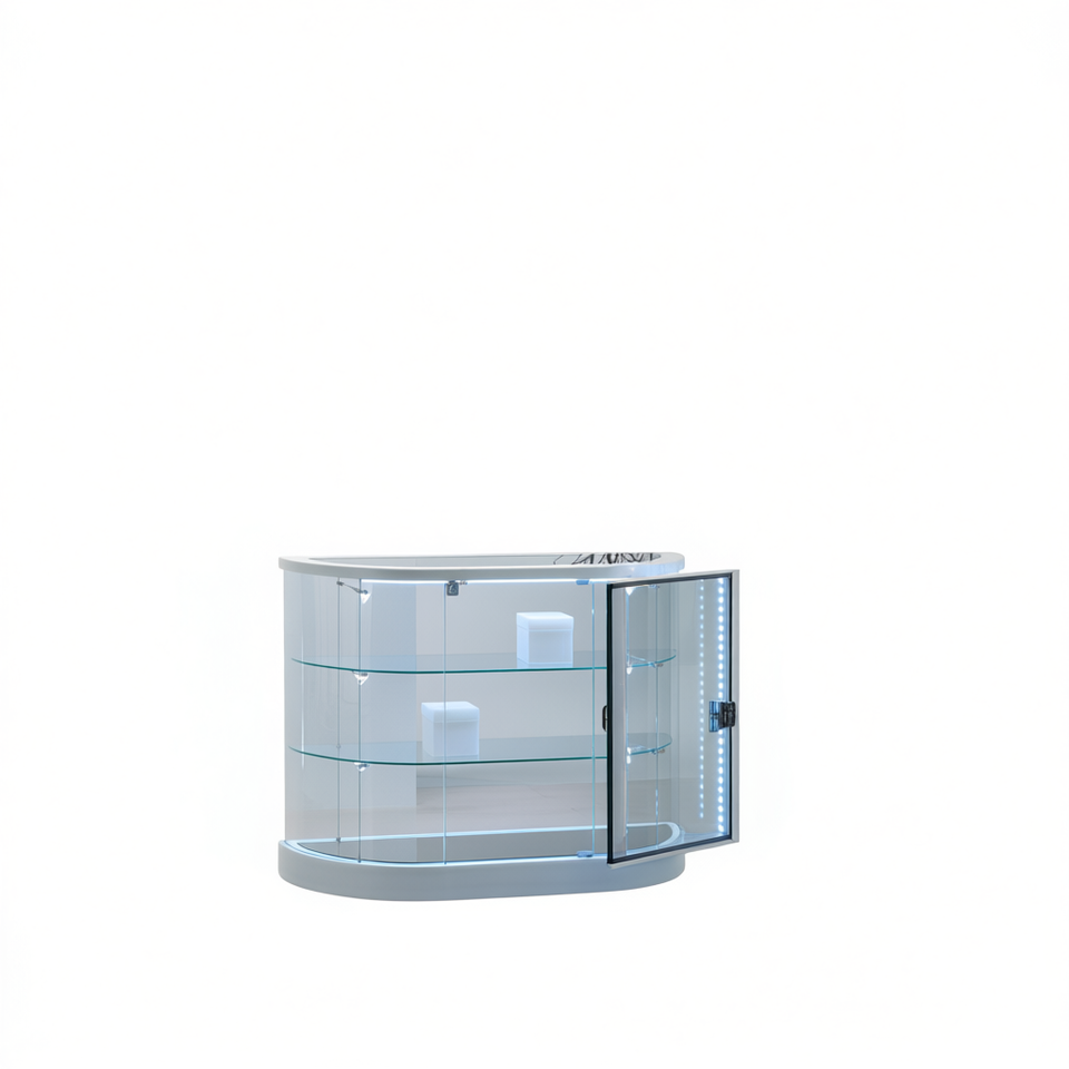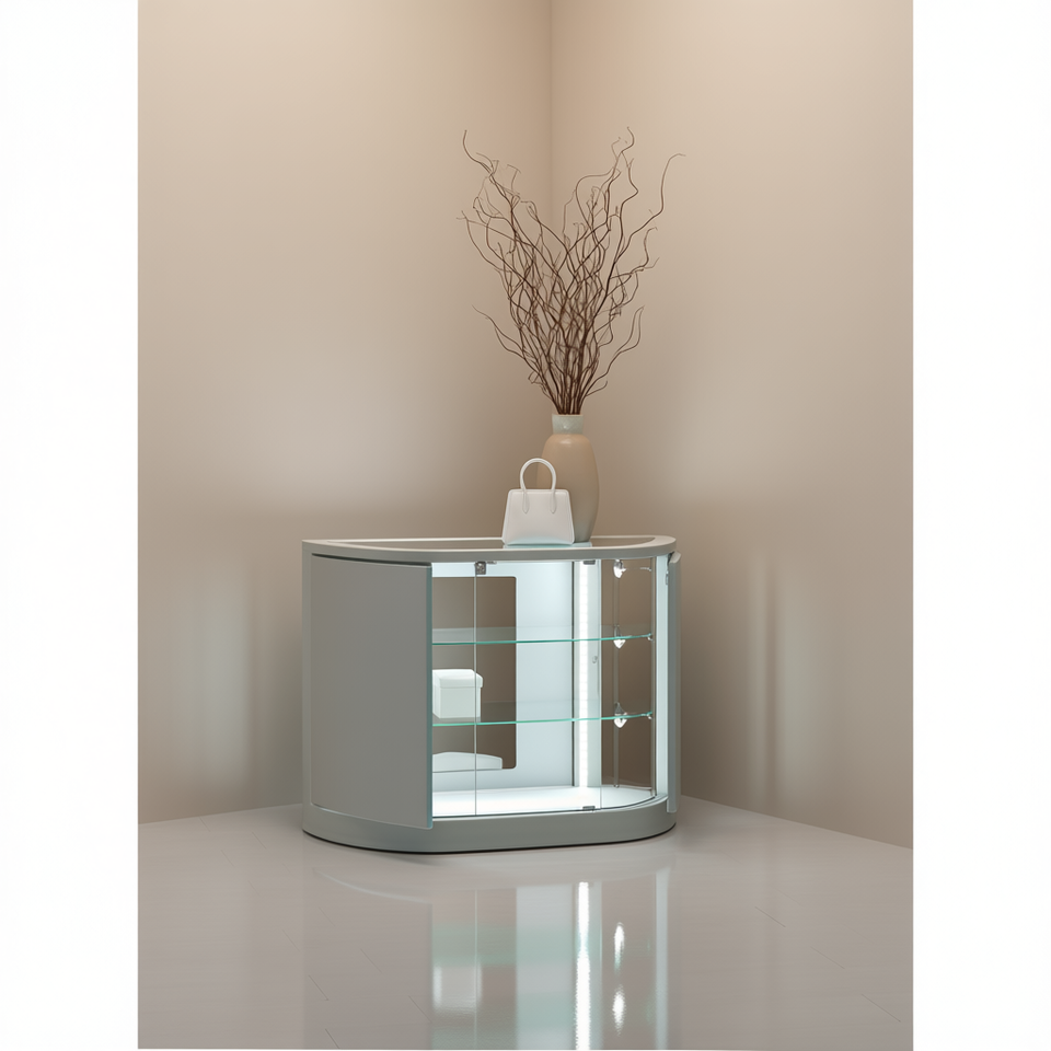 ตู้โชว์กระจกทรงครึ่งวงรีทันสมัย กว้าง 115 ซม. สีเทาอ่อน ประตูแบบมีบานพับพร้อมกุญแจล็อค ไฟ LED ชั้นวางปรับระดับได้