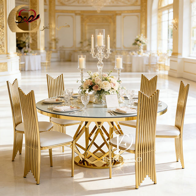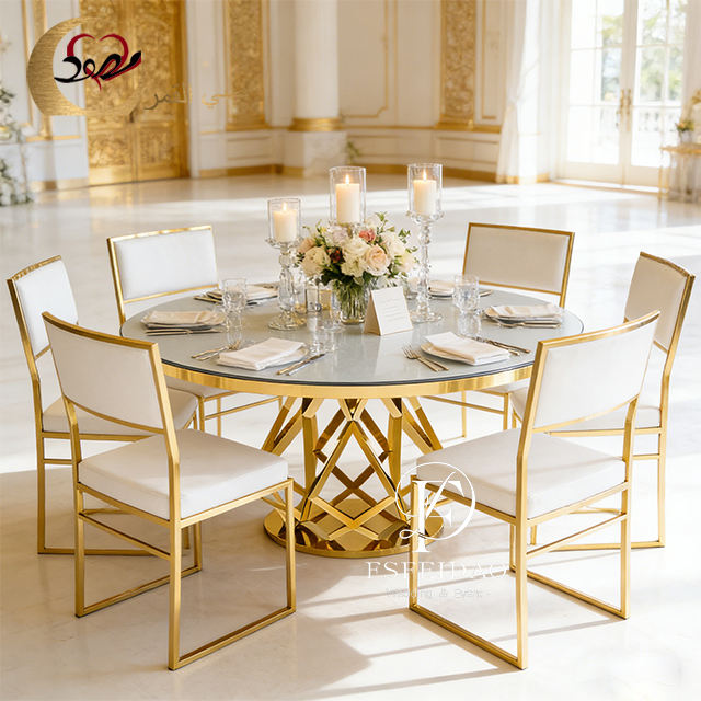 โต๊ะอาหารทรงกลมหน้ากระจกทันสมัย ฐานโลหะสีทอง สำหรับงานแต่งงานและให้เช่าในโรงแรม