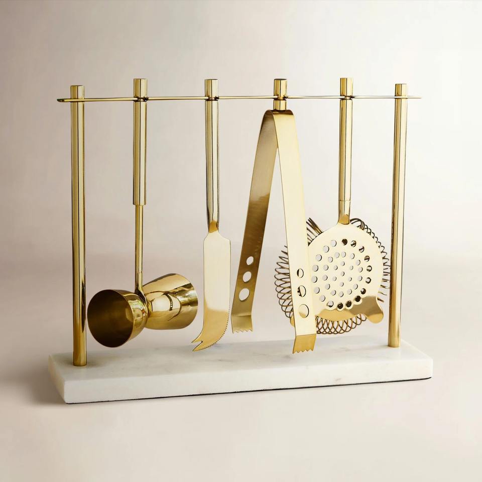 ชุดเครื่องมือบาร์ค็อกเทลด้ามจับทองทันสมัยพร้อมฐานหินอ่อนแบบแขวน เหมาะสำหรับบาร์ในบ้าน คลับ ของขวัญในโอกาสต่างๆ