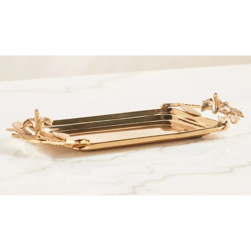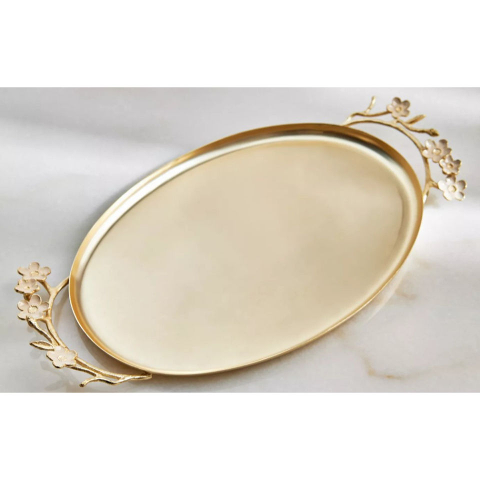 ถาดเสิร์ฟอาหารรูปวงรีทำจากโลหะสีทองทันสมัยพร้อมอุปกรณ์ตกแต่งโต๊ะลายดอกไม้ถาดเสิร์ฟอาหารสำหรับตกแต่งบ้าน