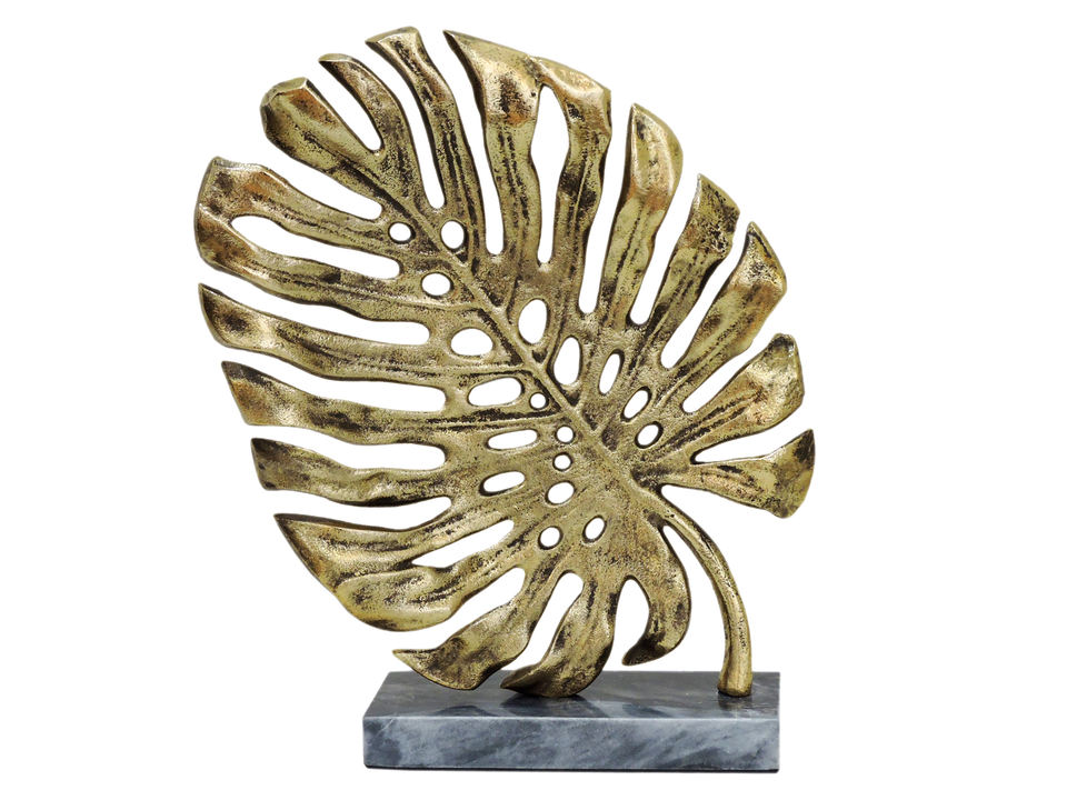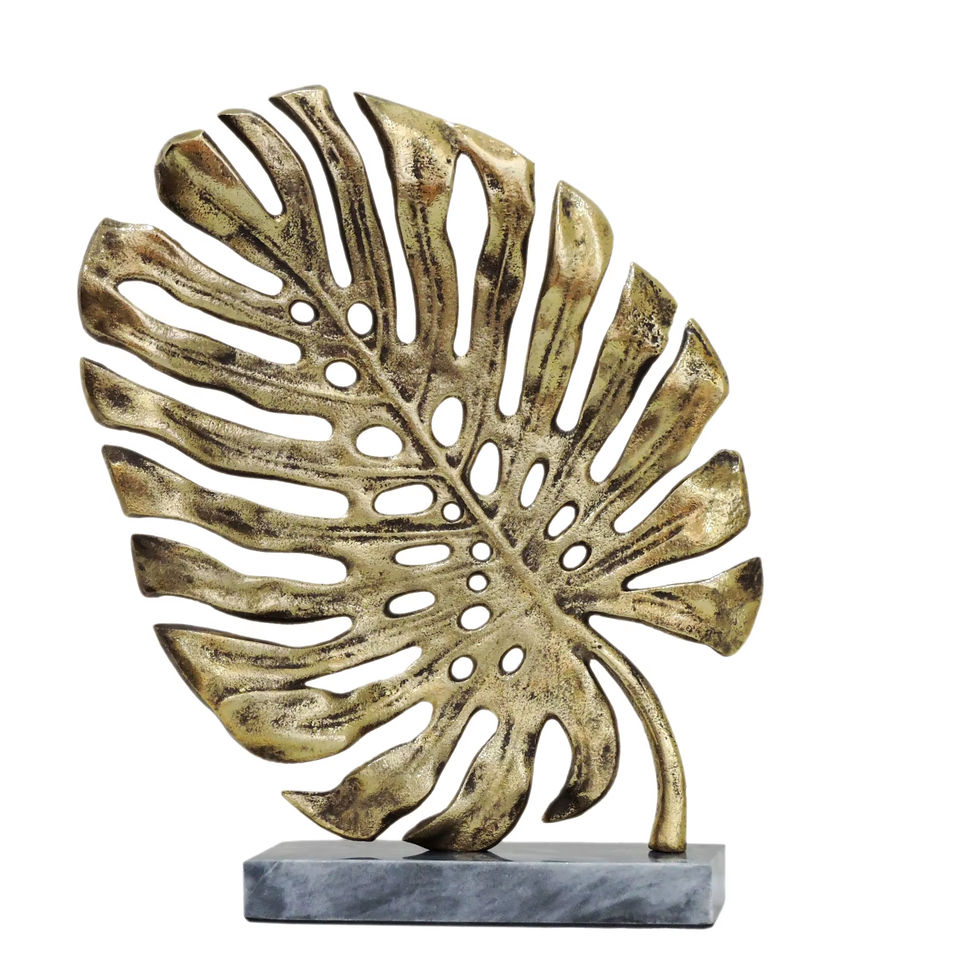 ประติมากรรมใบมอนสเตอร่าสีทองสมัยใหม่ ทำจากอะลูมิเนียม ตั้งบนฐานหินอ่อนสีเทา ตกแต่งด้วยทองเหลืองโบราณ รูปทรงใบปาล์มเขตร้อน สำหรับตกแต่งโต๊ะทำงาน