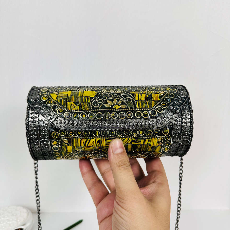 กระเป๋าคลัทช์โมเสคสีเหลืองโบราณเคลือบทองอะลูมิเนียมทันสมัย กระเป๋าถือสำหรับงานเลี้ยงตอนเย็นประดับลูกปัดขัดเงา สไตล์วินเทจอินเดีย