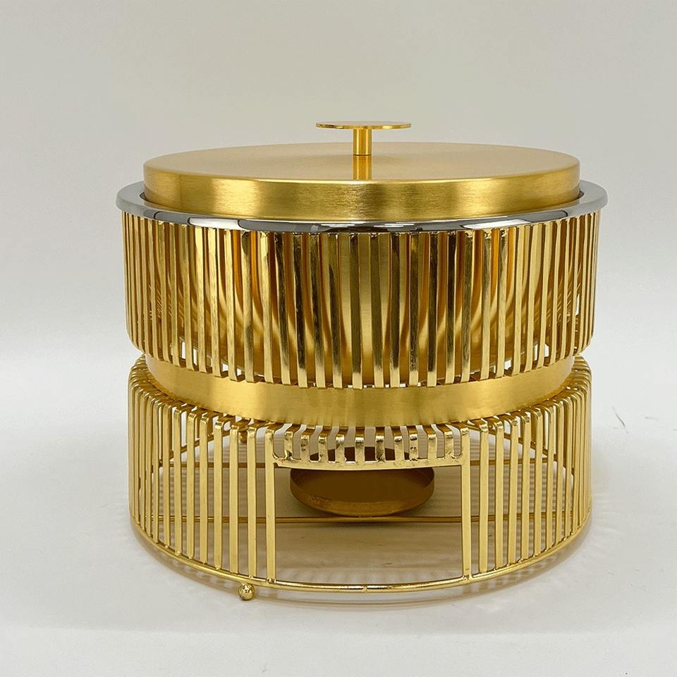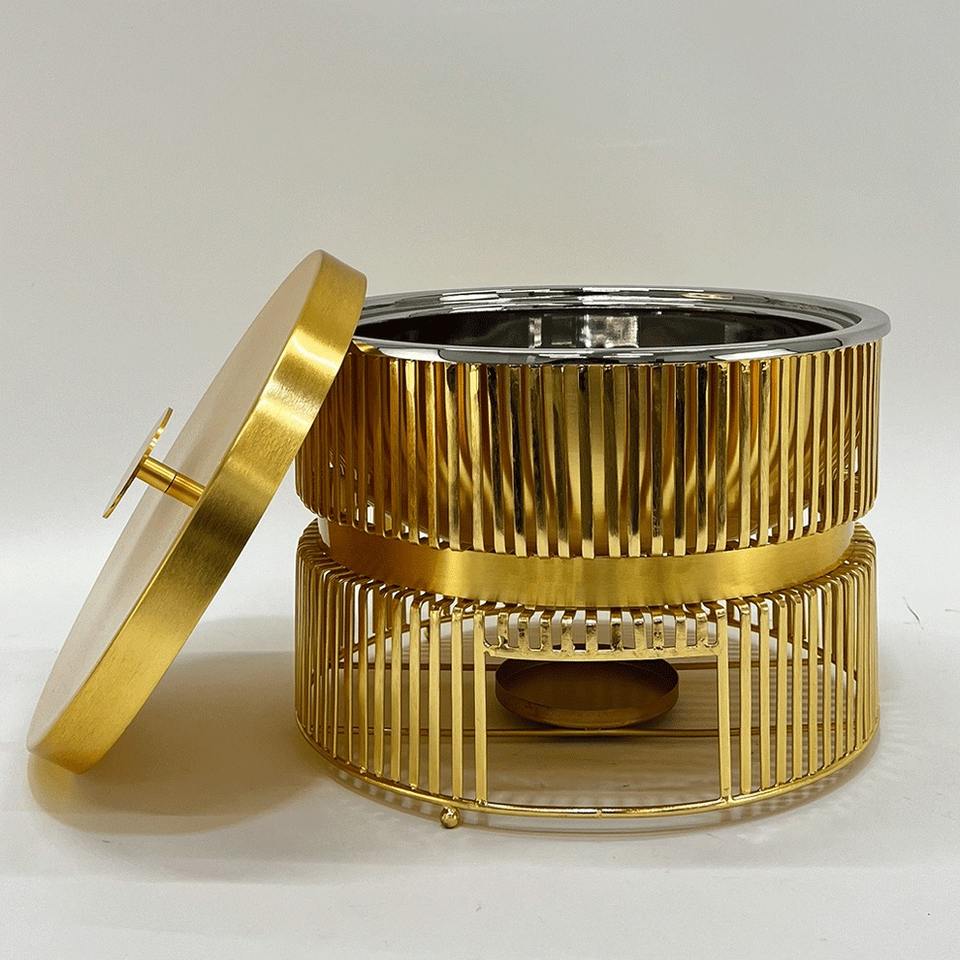 ถาดอุ่นอาหารทรงกลมสีทองทันสมัย ทำจากสแตนเลส พร้อมขาตั้งแบบแนวตั้ง สำหรับงานปาร์ตี้และจัดเลี้ยง