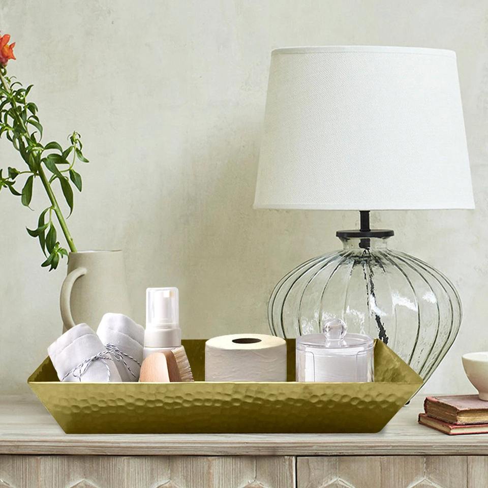 ถาดจัดระเบียบบนเคาน์เตอร์สแตนเลสสีทองทันสมัยสำหรับห้องน้ำ โต๊ะทำงาน ช่องเก็บของเดี่ยวสำหรับผลิตภัณฑ์ดูแลผิวและเครื่องสำอาง