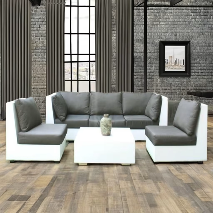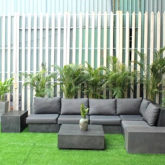โซฟาเข้ามุมรูปตัวแอลสีเทาคอนกรีตทันสมัย ชุดโซฟาปรับนอนได้แบบโมดูลาร์ พร้อมที่วางแขนแบบ Track Arm ทนทาน เหมาะสำหรับห้องนั่งเล่น