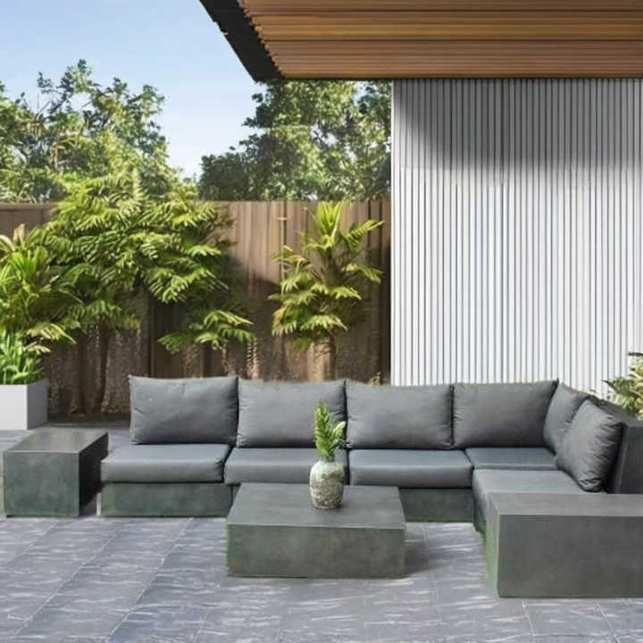 โซฟาเข้ามุมรูปตัวแอลสีเทาคอนกรีตสไตล์โมเดิร์น ชุดโซฟาเบดแบบแยกส่วน แขนโซฟาแบบ Track Arm ทนทาน เหมาะสำหรับห้องนั่งเล่น