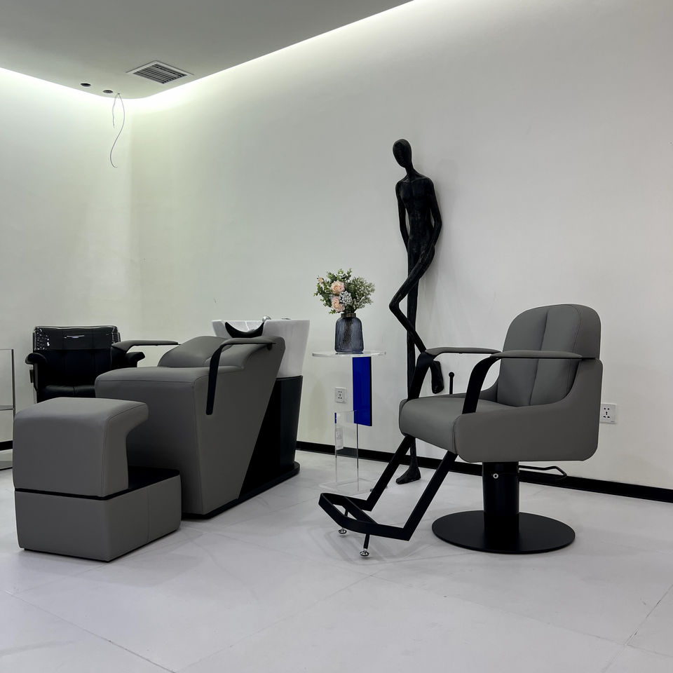 ชุดเฟอร์นิเจอร์ร้านเสริมสวยสีเทาสมัยใหม่ เก้าอี้ตัดผม เตียงสระผม สำหรับร้านเสริมสวยและร้านตัดผม