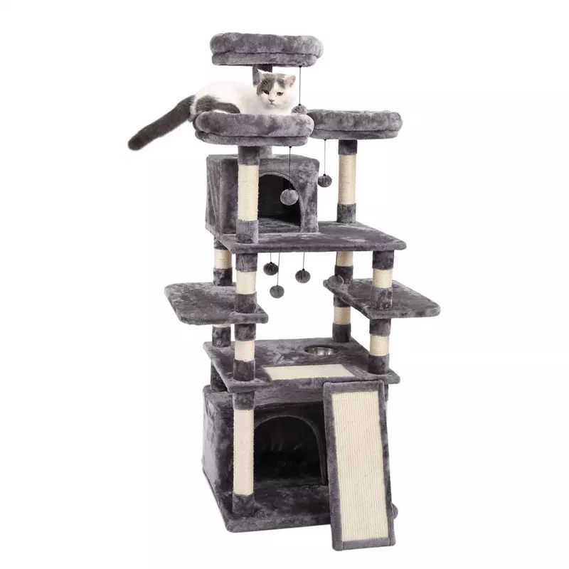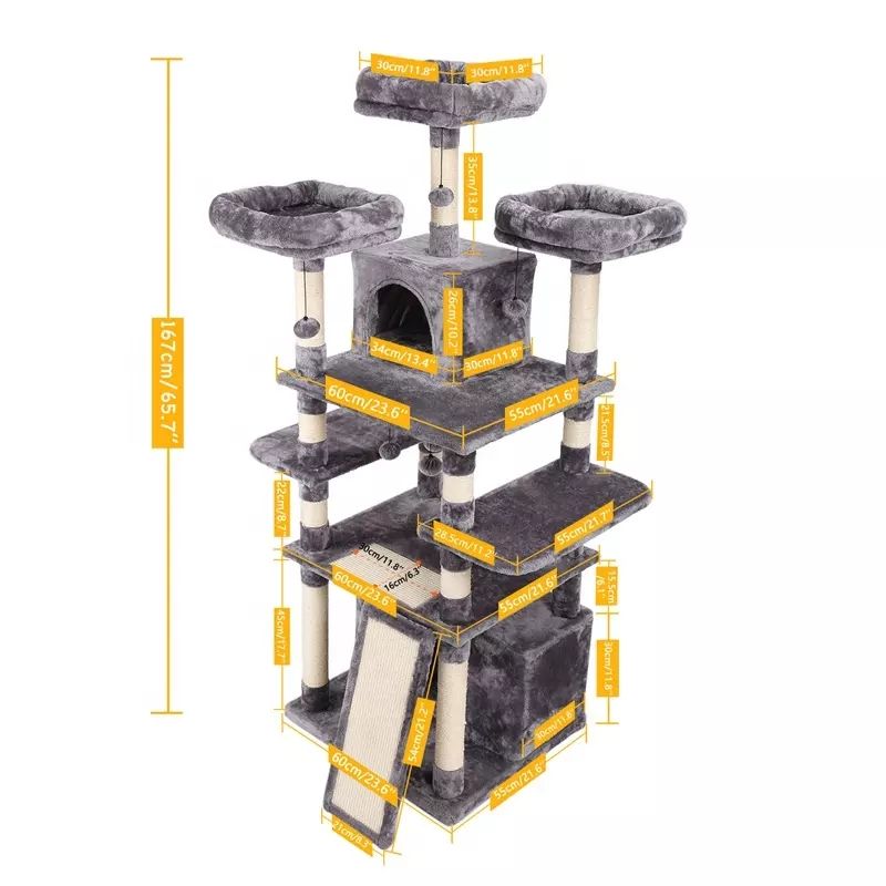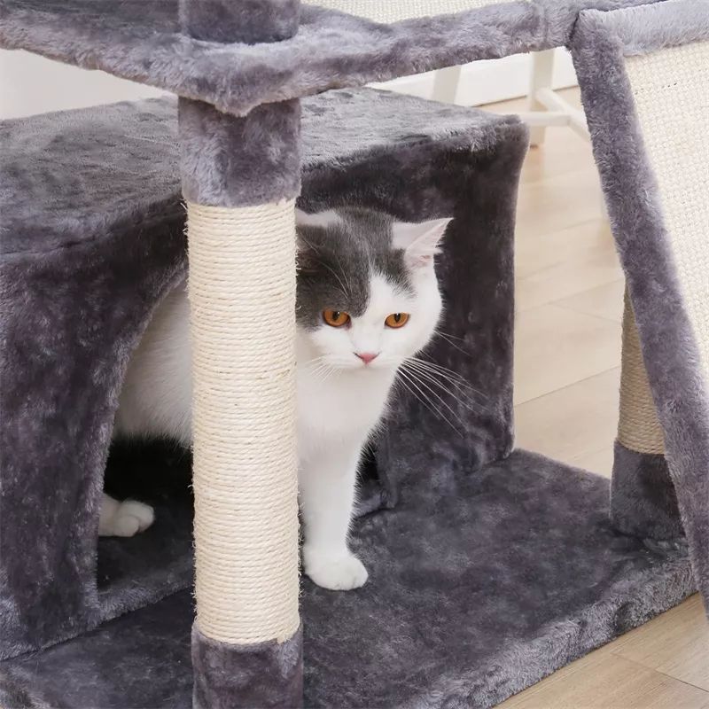 คอนโดกิจกรรมแมวสีเทาหอคอยไม้และป่านศรนารายณ์ที่ทันสมัยสำหรับบ้านที่มีรอยขีดข่วนบรรจุในกล่องได้สะดวก