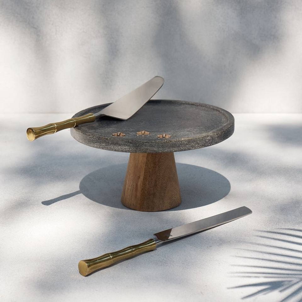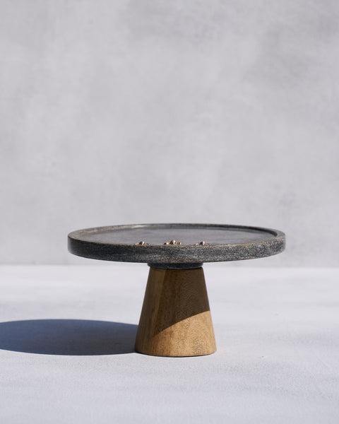 ฐานวางเค้กทรงกลมหินสีเทาโมเดิร์นพร้อมฐานไม้ตกแต่งลายผึ้งสีทอง ฐานวางขนมหวานแบบโมเดิร์นสำหรับตกแต่งบ้านและโรงแรม