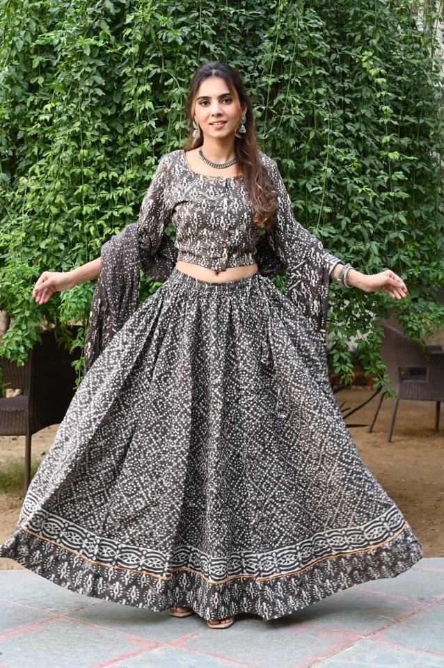 Modern Hand Block Cotton Print Lehenga Choli Set Dupatta for Wedding Diwali Beach Party Wear Women's Clothing Sun Protection