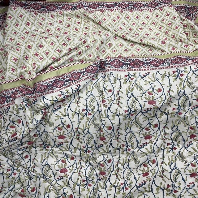 ผ้าปูที่นอนลายดอกไม้สีเขียว ขนาดคิงไซส์ ผลิตด้วยมือ ลายบล็อกพิมพ์ 100% ผ้าฝ้ายออร์แกนิค เป็นมิตรกับสิ่งแวดล้อม ใช้ได้สองด้าน ซักได้ เหมาะสำหรับโรงแรมและบ้าน