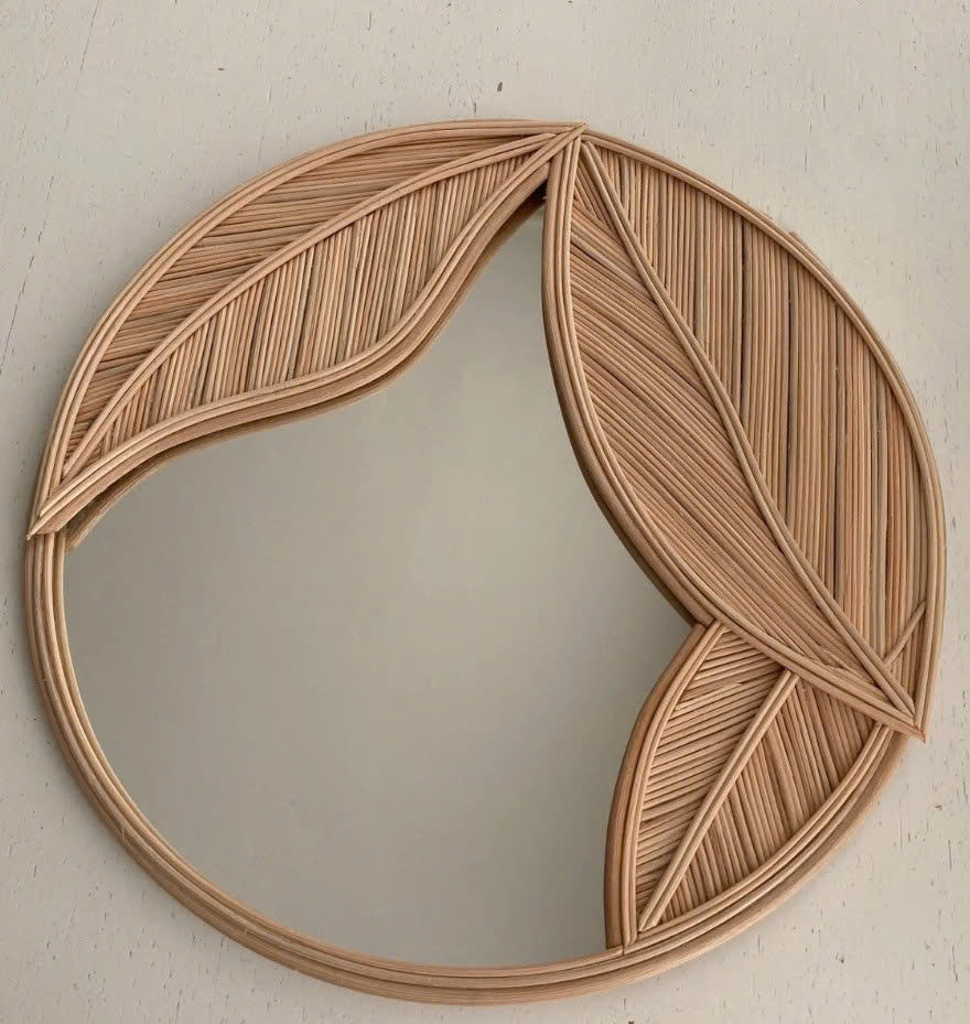 กระจกไม้ไผ่ทรงกลมงานทอมือสมัยใหม่พร้อมรายละเอียดใบไม้กระจกติดผนังตกแต่งเป็นมิตรกับสิ่งแวดล้อมงานฝีมือไม้ไผ่ธรรมชาติสำหรับตกแต่งบ้าน