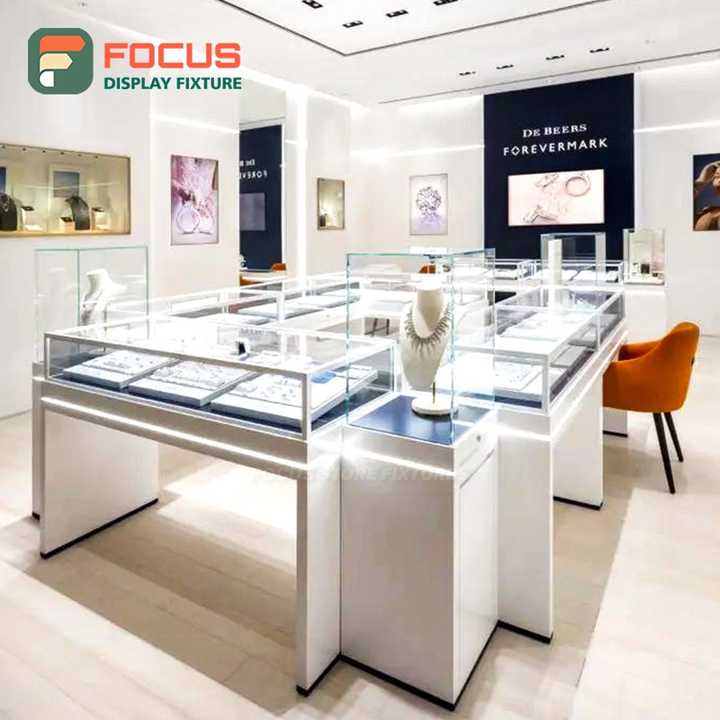 ตู้โชว์เครื่องประดับกระจกคุณภาพสูงทันสมัย โครงสร้างไม้และโลหะ พร้อมไฟ LED สำหรับร้านค้าปลีกและบูติก พร้อมขาตั้งโชว์ภายใน