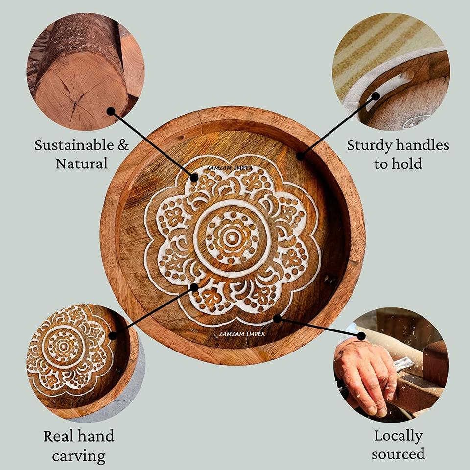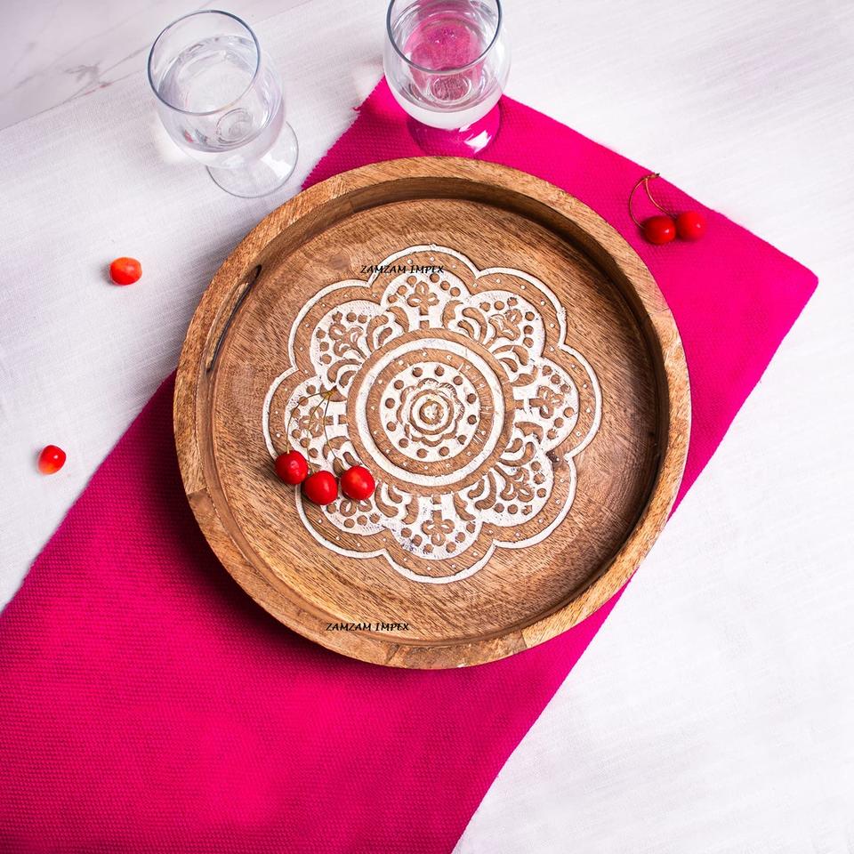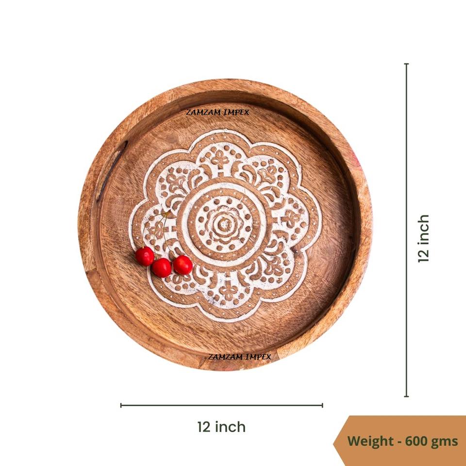 ถาดเสิร์ฟอเนกประสงค์ทรงกลมลายเรขาคณิตแกะสลัก ขนาด 12 นิ้ว สำหรับตกแต่งบ้านสไตล์โมเดิร์น ทำด้วยไม้ พร้อมหูจับไม้