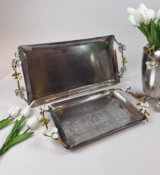 แผ่นรองถาดเคลือบแบบอินเดียที่ทันสมัยพร้อมชามสแตนเลสชุบเงินพร้อมลายดอกไม้