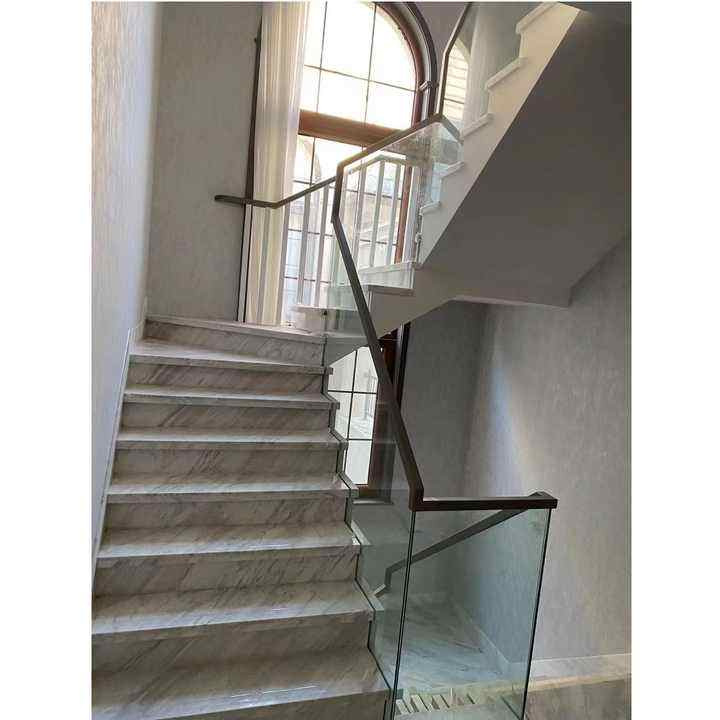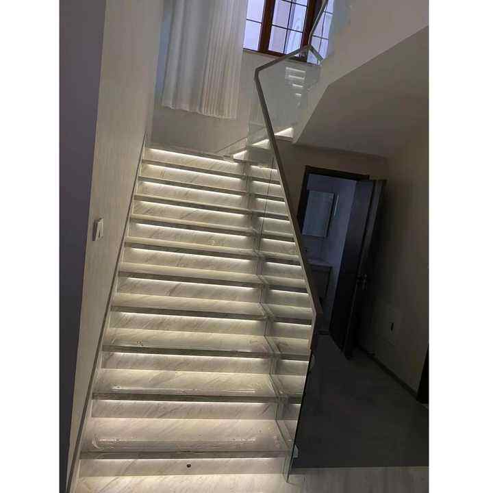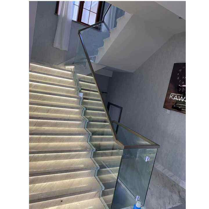 ราวบันไดกระจกในร่มที่ทันสมัยพร้อมวัสดุกระจกกันน้ำสำหรับใช้ในบันไดดีไซน์ร่วมสมัย