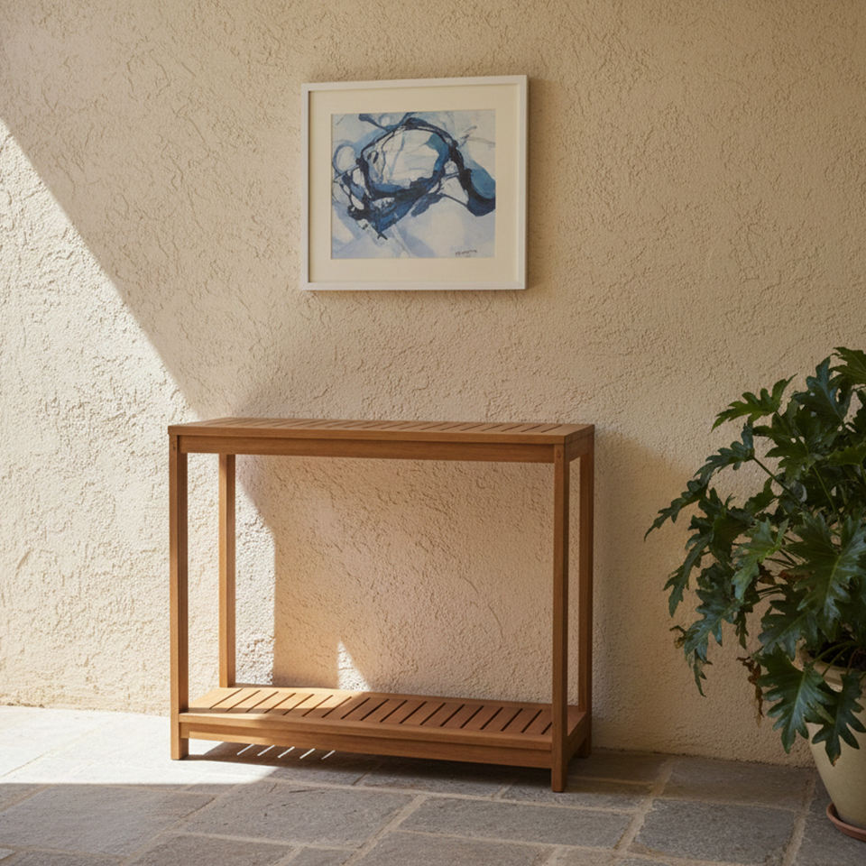 โต๊ะคอนโซลไม้สักแบบแผ่นไม้ระแนงสำหรับตกแต่งภายในและภายนอกอาคาร ดีไซน์ทันสมัย หรูหรา ผิวสัมผัสธรรมชาติ รูปทรงสี่เหลี่ยมผืนผ้า เหมาะสำหรับทางเข้าบ้านหรือโถงทางเดิน