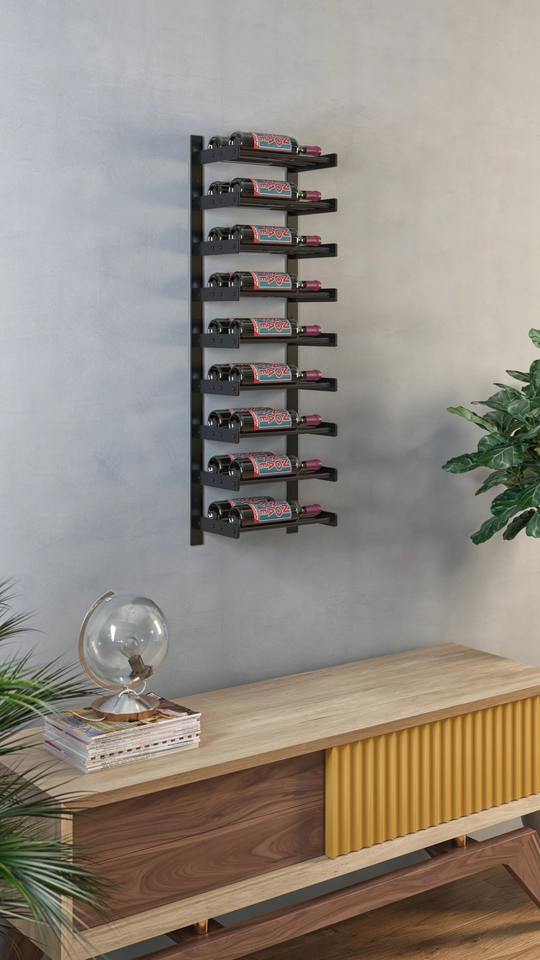 ชั้นวางไวน์ติดผนังเหล็กสีดำสไตล์อินดัสเทรียลทันสมัย ความจุ 9 ขวด แนวตั้ง ป้ายชื่อชัดเจน ป้องกันสนิม สำหรับโชว์ขวดไวน์