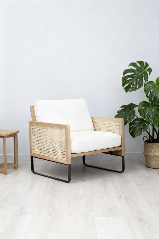 Sturdy metal frame with wooden armrests, soft leather cushions, minimalist industrial look, durable and comfortableลักษณะ