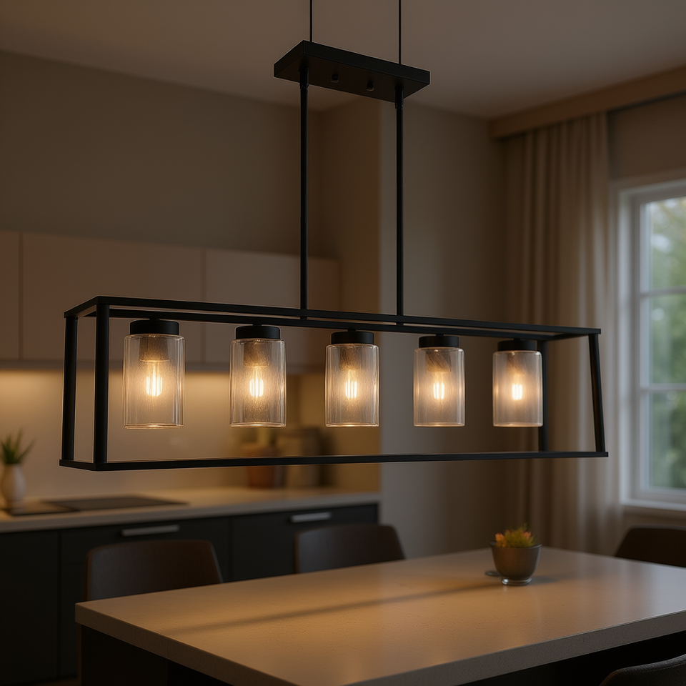 โคมไฟเพดานอุตสาหกรรมสมัยใหม่ 5 ดวง โคมแก้วสีดำด้านทรงสี่เหลี่ยมผืนผ้า สำหรับห้องรับประทานอาหารและโคมไฟเหนือเคาน์เตอร์