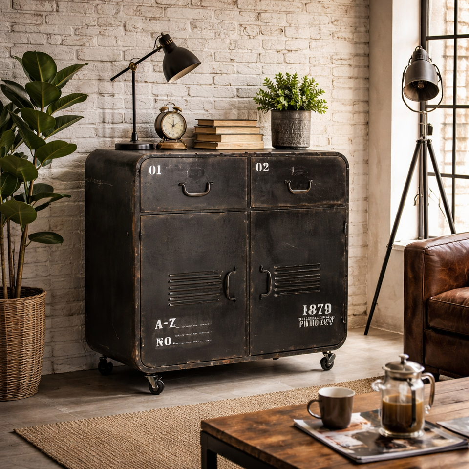 ตู้เก็บของโลหะสไตล์วินเทจอุตสาหกรรม | ตู้เก็บของเหล็กสีดำแบบมีล้อ | ตู้เก็บของในห้องนั่งเล่น