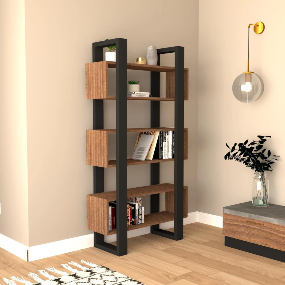 ตู้หนังสือติดผนังสไตล์อุตสาหกรรมที่ทันสมัยพร้อมชั้นวางลอยกรอบโลหะสำหรับซุปเปอร์มาร์เก็ตในบ้านหรือบ้านไร่