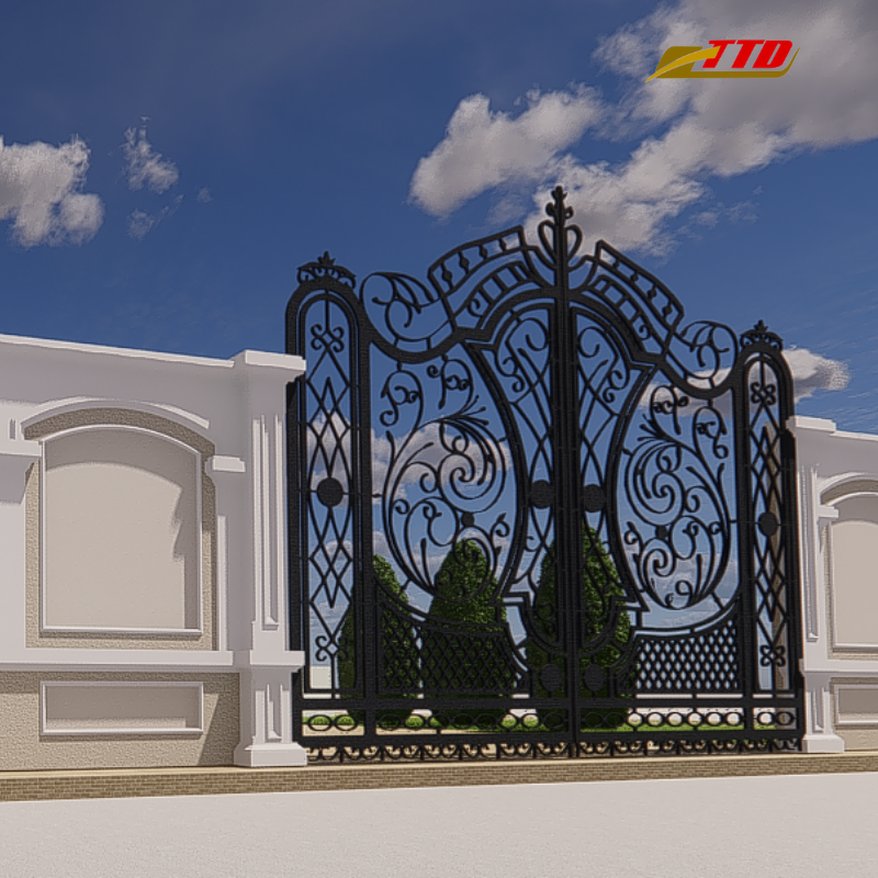 การออกแบบประตูเหล็กที่ทันสมัยมีเส้นที่ชัดเจนกรอบเหล็กแข็งแรงแบบจำลอง3D สูง7ฟุตเป็นมิตรกับสิ่งแวดล้อมสำหรับสถาปัตยกรรมที่อยู่อาศัย