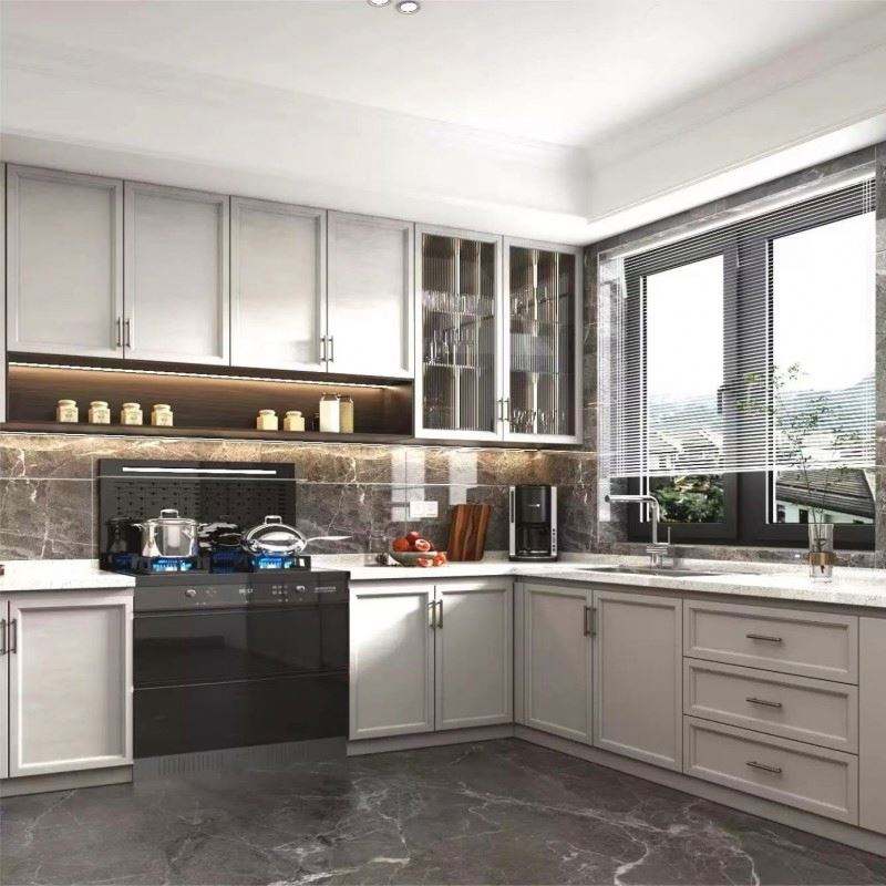 ชุดเฟอร์นิเจอร์ครัวทันสมัยพร้อมตู้เก็บของแบบมีประตูกระจก บานพับหินอ่อน ลิ้นชัก ตะกร้า ชั้นวางของแบบกำหนดเอง ดีไซน์ครบครันสำหรับขาย